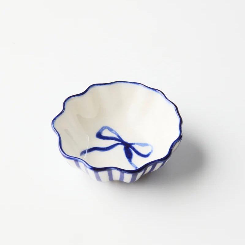 Scalloped edges rise to meet careful brushstrokes of indigo blue in this petite earthenware dish. Designed in Sydney and hand-painted in Vietnam, the Margot Dish cradles your most precious objects rings, earrings, while its ribbon-like decoration transforms average spaces into sanctuaries of whimsical beauty.