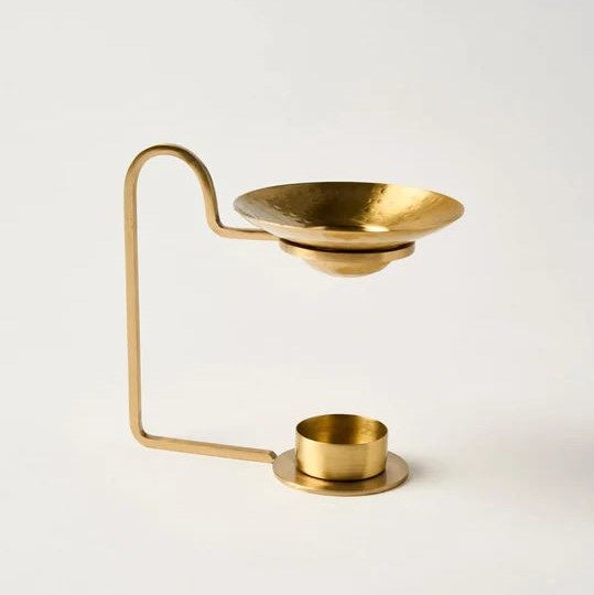 Features a brass handle, a hollow pillar for a tealight candle, and a hand-hammered brass plate for water & essential oil.