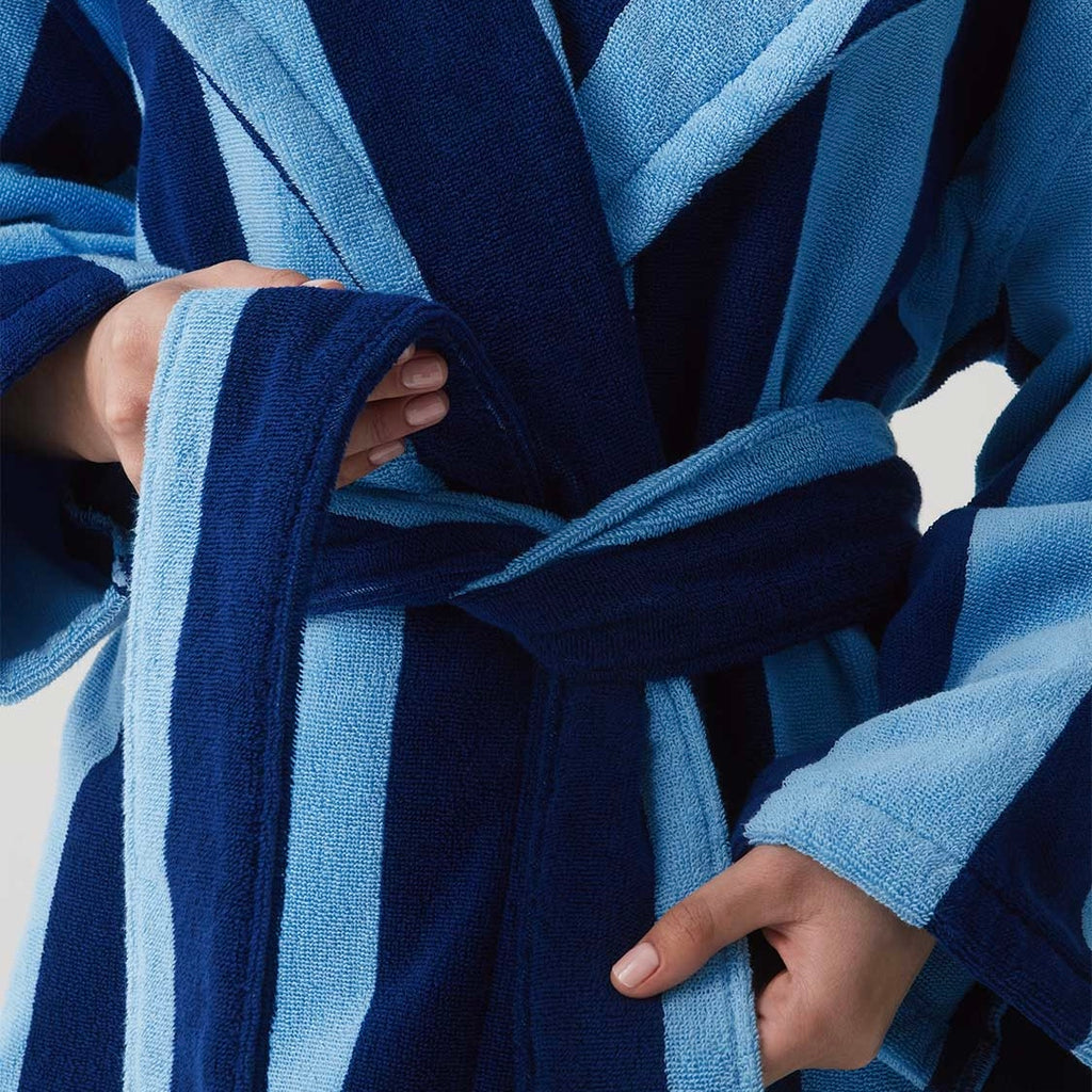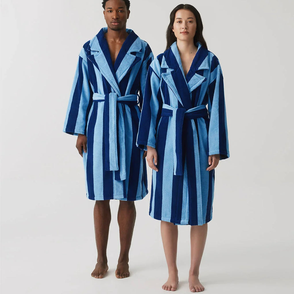 Thoughtful details elevate the experience: a unisex fit with a classic shawl collar, functional pockets, and an adjustable, removable waist tie. A discreet hanger loop inside the collar makes storage simple, while its versatile design can be worn open or tied. This is a robe designed to be lived in—it’s comfort, style, and function, all in one.