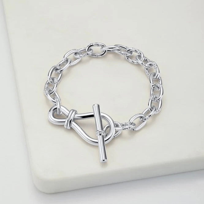 A bold and chunky statement bracelet, crafted with intricate detail, this bracelet features striking link chains and a unique fob detail. Designed to perfectly match our cult favourite Alannah necklace and hoops, it completes your ensemble with effortless sophistication.