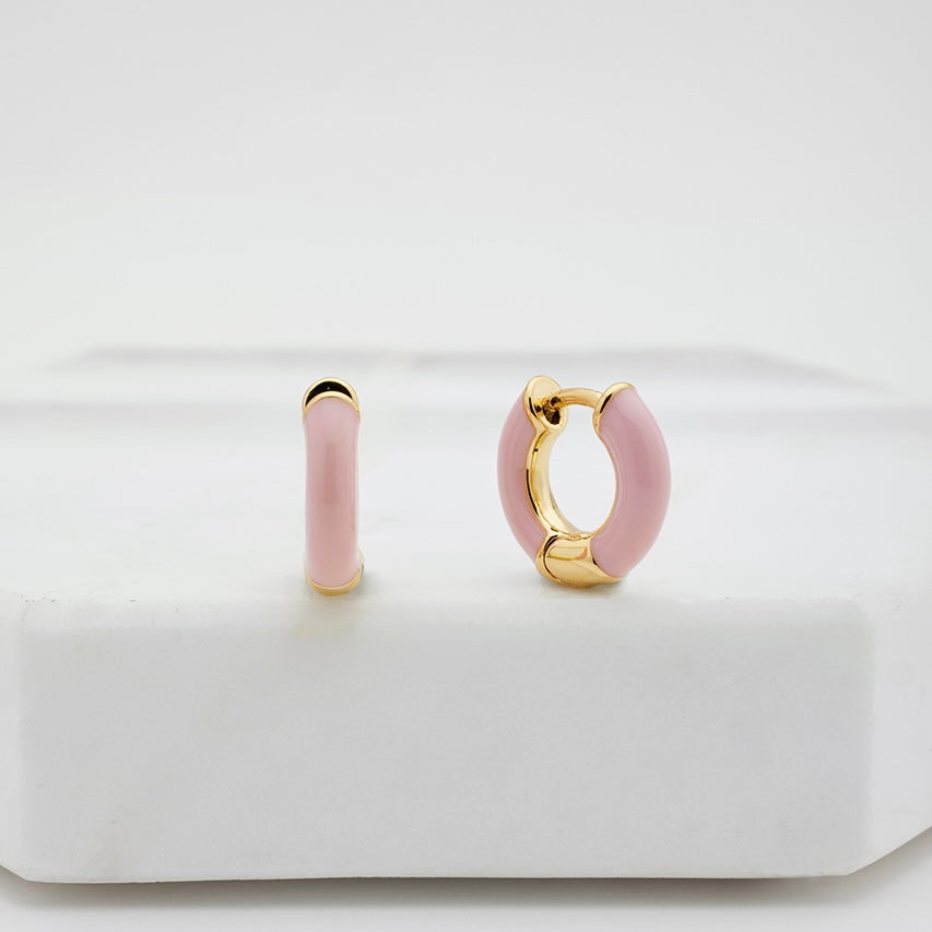 The Nova Huggie in pink enamel is a delicate yet bold pop of colour, ideal for layering or wearing solo.