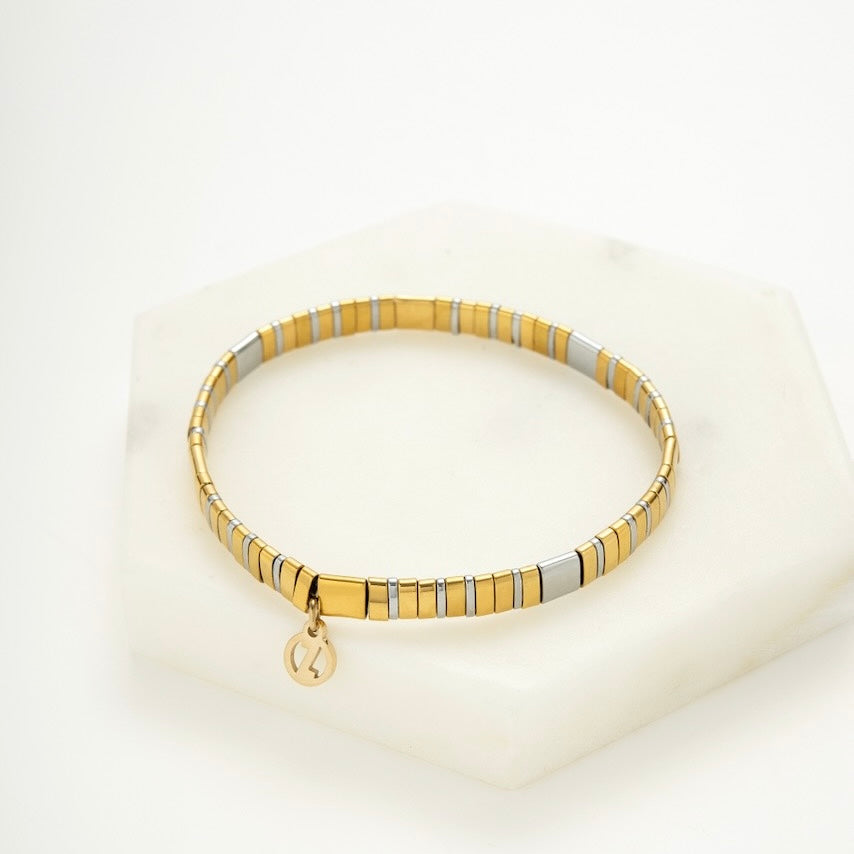 This tile bracelet showcases a mix of silver & gold beads, adding a touch of sophistication to your wrist. Crafted with meticulous attention to detail, the Tile Bracelet exudes a timeless charm that effortlessly elevates any ensemble.