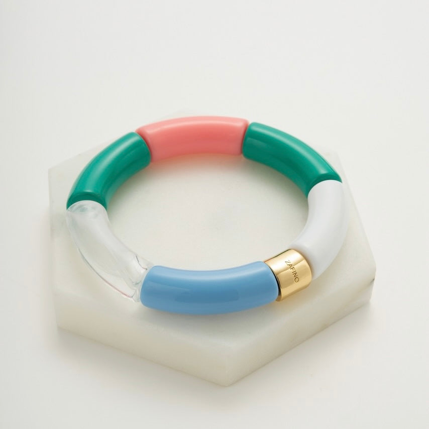 Make a bold statement with this resin tube bangle in a striking teal blue, contrasted by luxe gold-tone metal detailing. The tubular silhouette offers a modern edge, while the vibrant colour adds a fresh pop to your jewellery rotation. Lightweight yet impactful, it’s the ultimate accessory for elevating your everyday style.