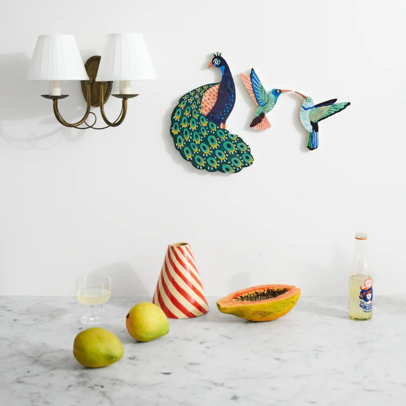 Tiny birds, big charm. This joyful hummingbird hand-painted wall art, crafted from light-catching capiz shell in shades of jade, blush and sky blue. Hang them in flight together or let them flutter across a gallery wall. We love the idea of them either side of a round mirror.