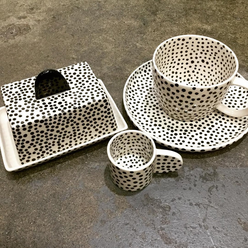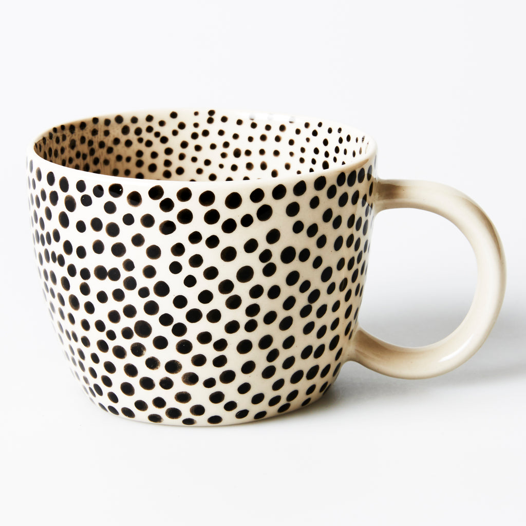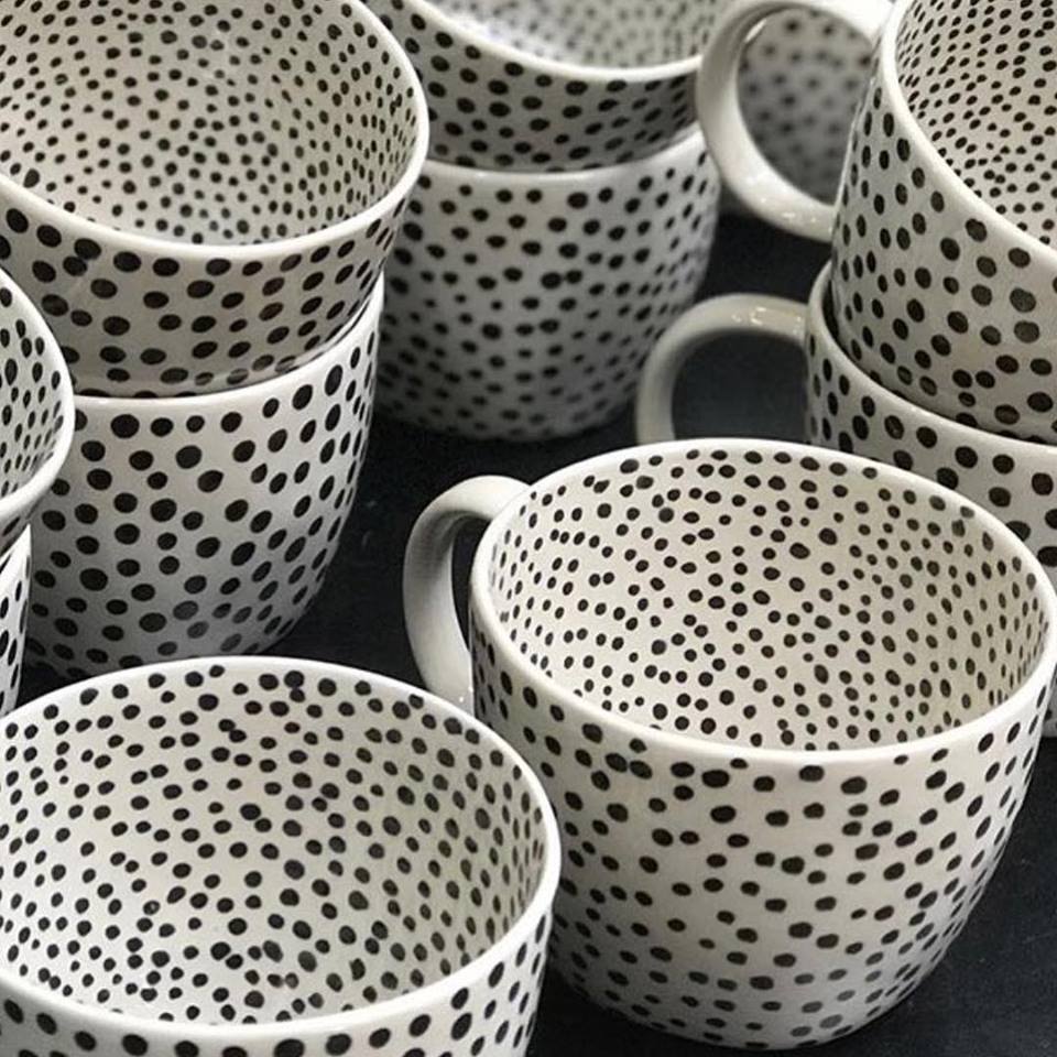 Intricate hand painted polka dots are applied to the inside and outside of this useful mug. Our bestselling shape comes in several designs to mix and match and stack into each other for a lovely display in the kitchen. Holds 250ml