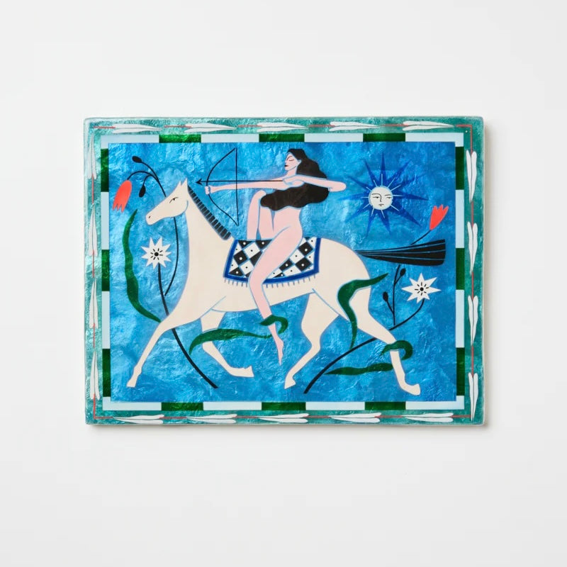 The Fable Horseback Blue Rectangle captures mythic journey through luminous Capiz shell and dynamic composition. This beautiful talisman showcases a rider traversing a celestial landscape - a protective object that brings both movement and stillness to your walls. This statement piece creates a moment of pause in your space, try combining with other tiles in the Fable range for a larger wall statement.