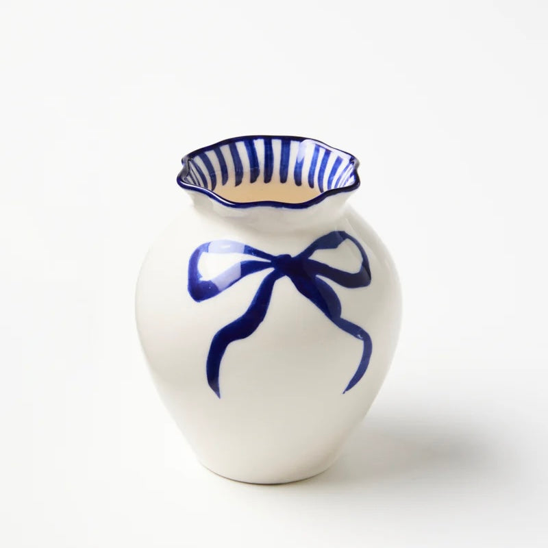 A sculptural vessel where form and function create perfect harmony. Hand-painted indigo ribbons loop with gentle asymmetry across this earthenware vase, created in our Sydney studio and brought to life by Vietnamese artisans. Perfect for a single stem on your bathroom shelf or bedside table an everyday object elevated through thoughtful design.