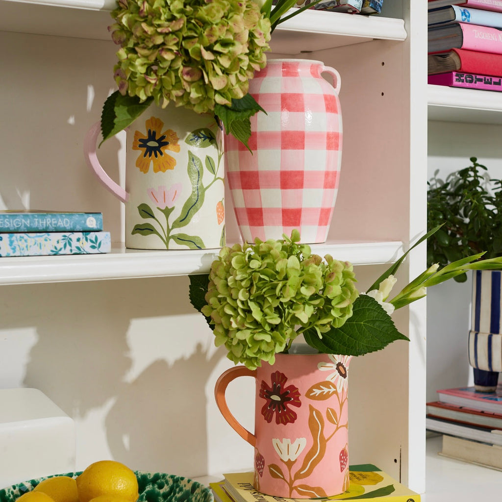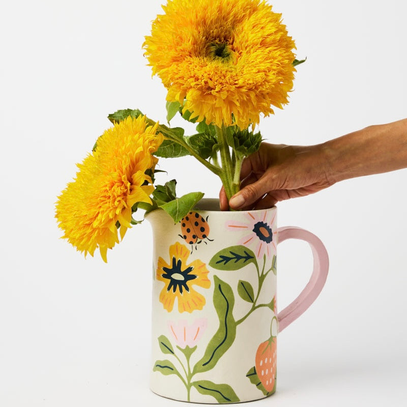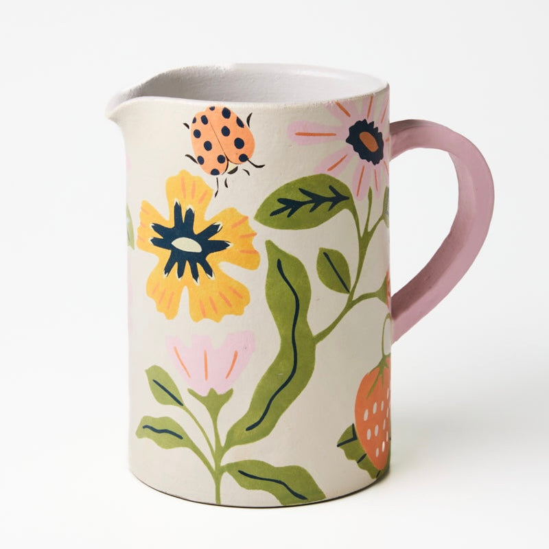 Our Meadow Jug in white creates a natural canvas for hand-painted wildflowers, strawberries, and verdant stems each brushstroke applied by our partners in Santo Tomas, Philippines. This wheel-thrown statement piece with its warm terracotta handle brings folk-inspired botanical charm to shelves and sideboards. Not a precious object but a generous companion for daily living, its slight variations in brushwork evidence of the human touch.