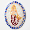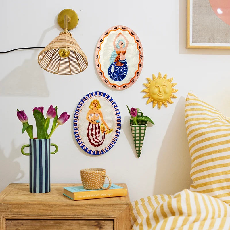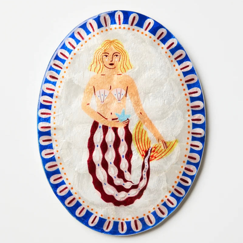 Our Mermaid Coral Cowrie Wall Art marries luminous Capiz shell with hand-painted folk imagery, where this golden-haired siren with burgundy scales emerges from her translucent oval canvas. Framed by contrasting cobalt scallops, this isn't merely a coastal decoration but a narrative object bringing unexpected joy to bathroom walls and kitchen alcoves alike each piece's natural shell variations ensuring your mermaid guardian carries her own distinct personality.