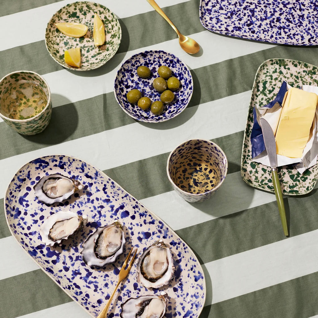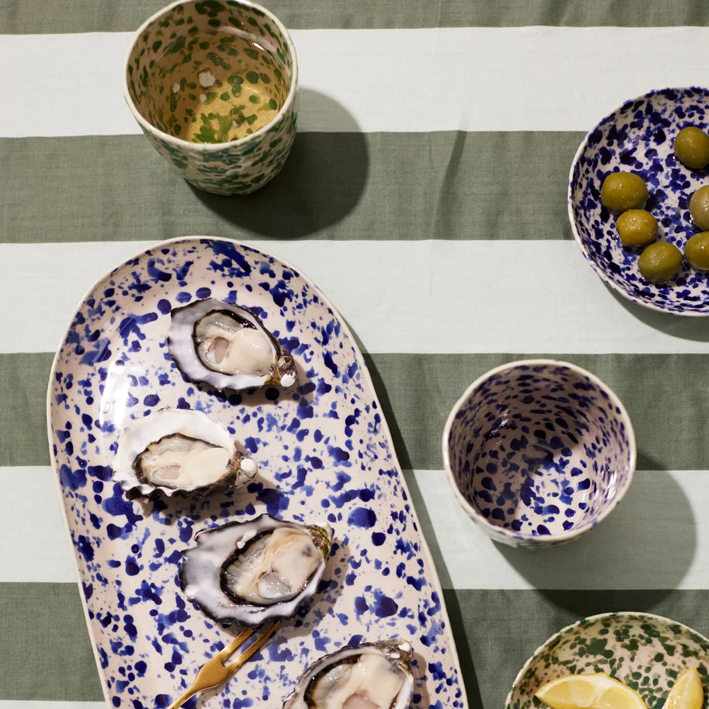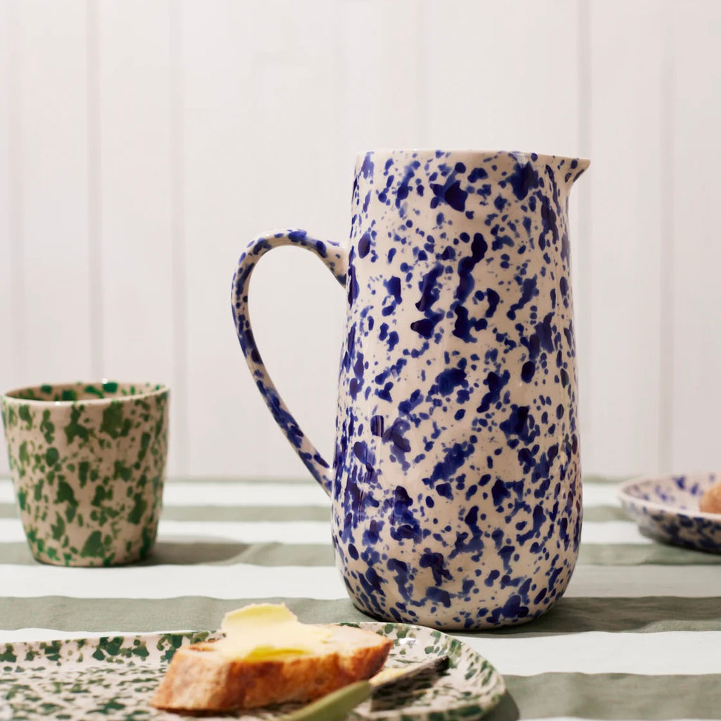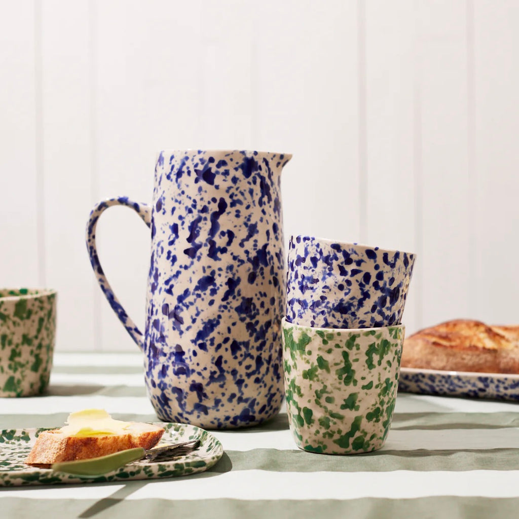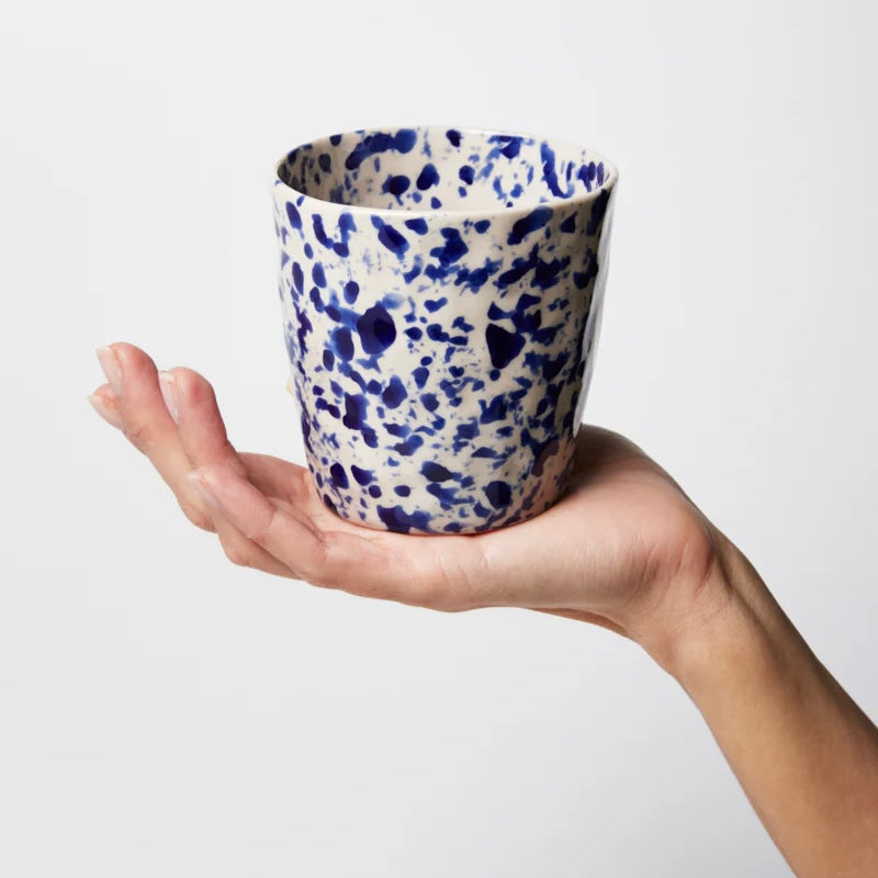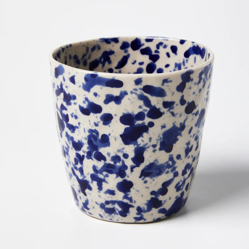 Sip from inspired Puglian splatterware artistry with the Splatter Tumbler in Blue. Each one-of-a-kind tumbler features spontaneous navy glazed splatters hand-painted over an unglazed stoneware body by skilled artisans. The stylish straight-sided cylindrical shape offers a modern silhouette for enjoying beverages infused with timeless Italian ceramic tradition and freeform brushwork design.