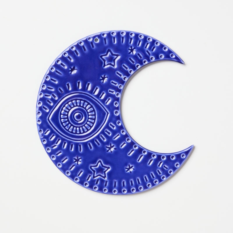 The Indigo Moon Talisman captures celestial energy through richly glazed bone china in deep, cosmic blue. Each crescent is meticulously debossed by hand with protective symbols - watchful eyes, stars, and ancient markings that connect your space to traditions of symbolic safekeeping. This glossy ceramic guardian creates striking presence when arranged in a protective constellation with companion pieces or as a singular statement in intimate spaces.