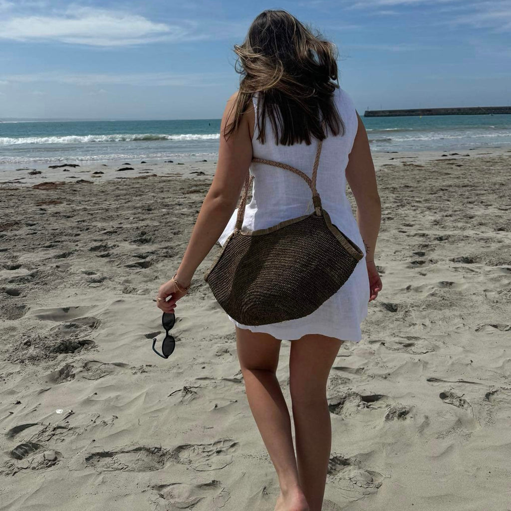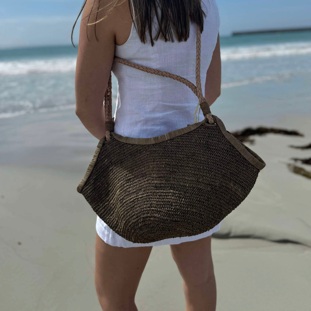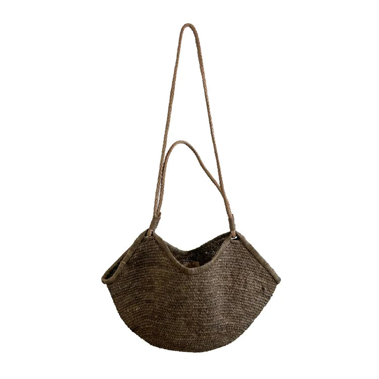 A delicate shell-shaped bag designed for everyday use, featuring beautifully braided double straps one long and one shorter for extra comfort – hand made and woven from durable, sustainably harvested raffia fibres.