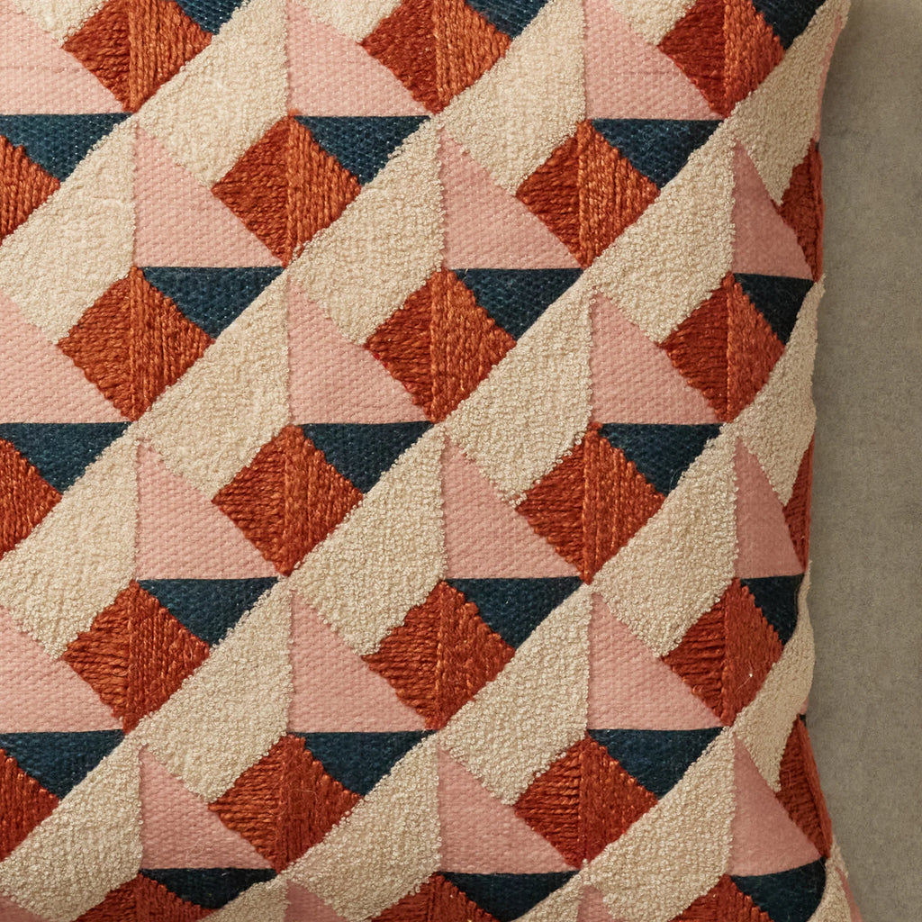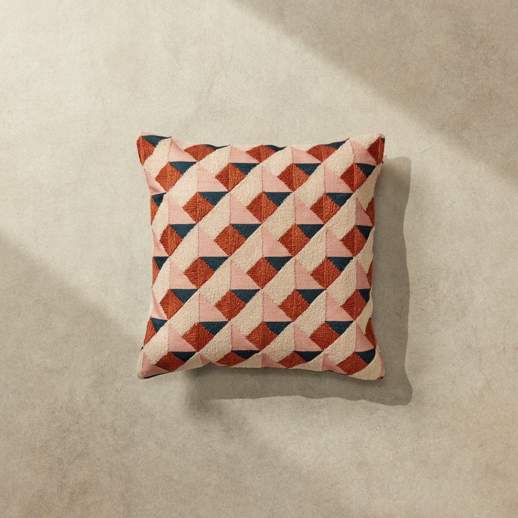 Introducing Caspian Cushion, a delightful blend of comfort and style. This throw cushion boasts a captivating irregular weaving pattern and a melding of rich colours in shades of orange, pink, and navy. The decorative cushion cover is skillfully crafted, showcasing a geometric design with a knife edge finish.The multicoloured palette adds vibrancy to your space. Crafted from high-quality materials, Acrylic and PET polymer the cushion cover is soft yet very durable.