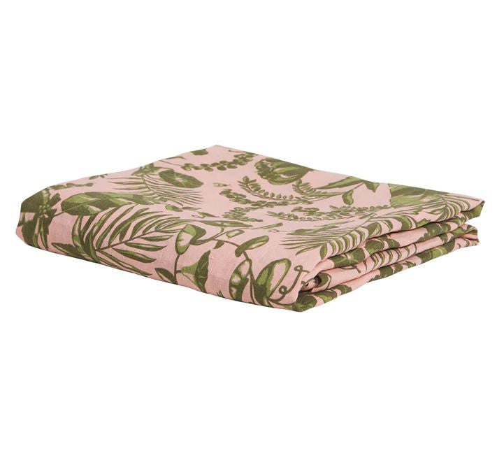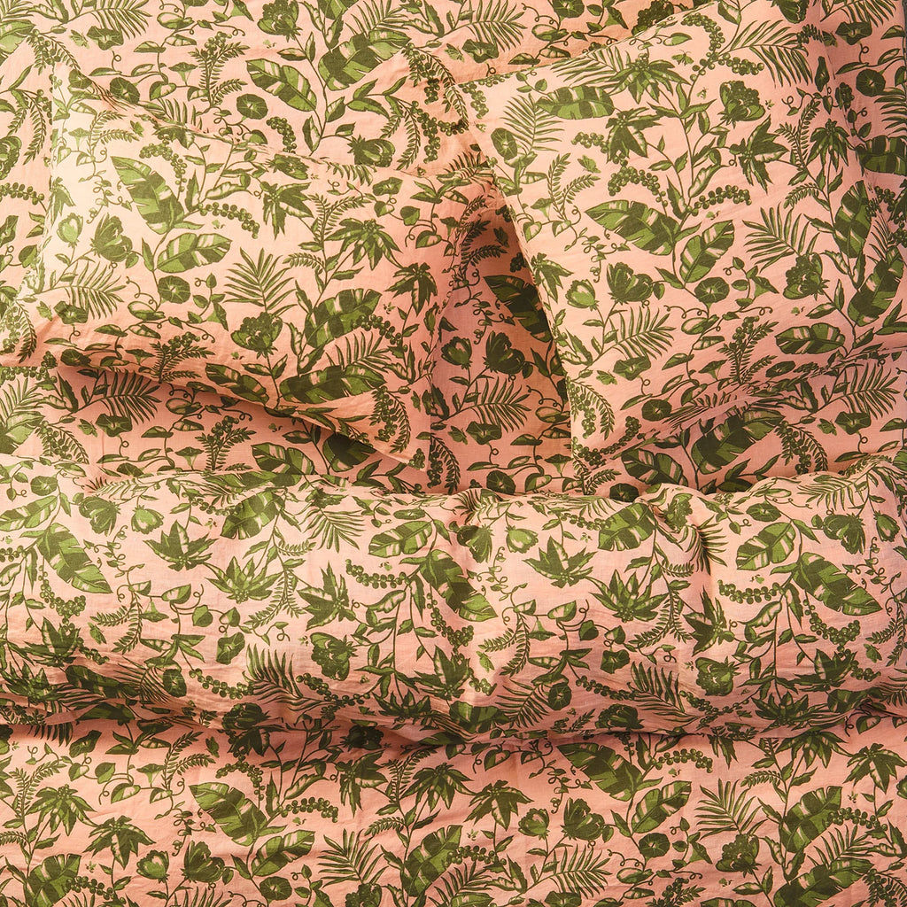 “Escape to exotic destinations with this opulent tropical print. Our Safia linen is inspired by vintage wallpaper reminiscent of high-end hotels of Singapore in the ’70s. The design brings to mind palm trees paired with luxe chrome, rattan and marble finishes. Complete the look or lean into pattern layering for an inviting eclectic vibe.” – Phoebe’s Style Notes