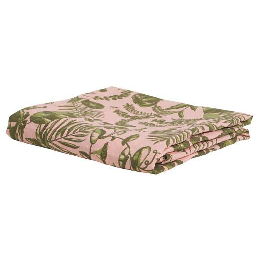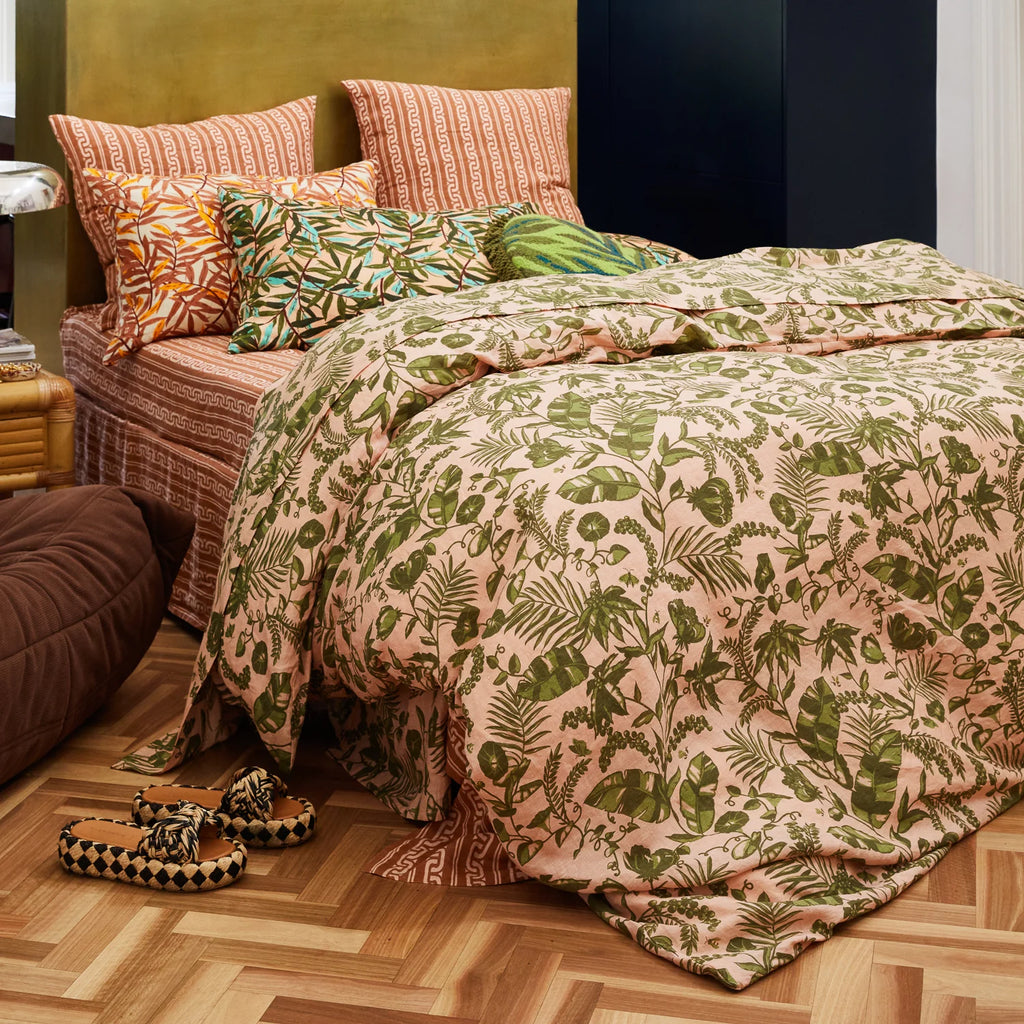 “Escape to exotic destinations with this opulent tropical print. Our Safia linen is inspired by vintage wallpaper reminiscent of high-end hotels of Singapore in the ’70s. The design brings to mind palm trees paired with luxe chrome, rattan and marble finishes. Complete the look or lean into pattern layering for an inviting eclectic vibe.” – Phoebe’s Style Notes
