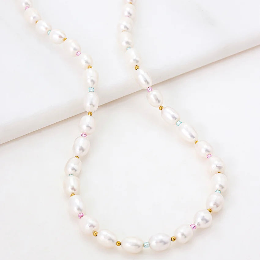 The Aria Pearl Necklace is a fresh take on classic pearls, blending timeless elegance with a playful twist. Featuring lustrous freshwater pearls interspersed with pastel-toned beads and delicate gold accents, this piece brings a subtle pop of colour to your everyday look. Perfect for layering or wearing solo, Aria captures a balance of sophistication and modern charm.
