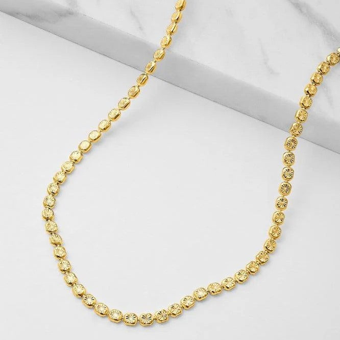 A versatile and stunning accessory that adds a touch of elegance to your neckline. This necklace features a disk pendant with delicate engravings, creating a beautiful and intricate design. Its disk detail adds a modern and stylish element to the piece, while the necklace's length makes it the perfect layering companion. Whether worn alone for a minimalistic look or layered with other necklaces for a fashionable statement, the Belle Necklace effortlessly enhances your style.