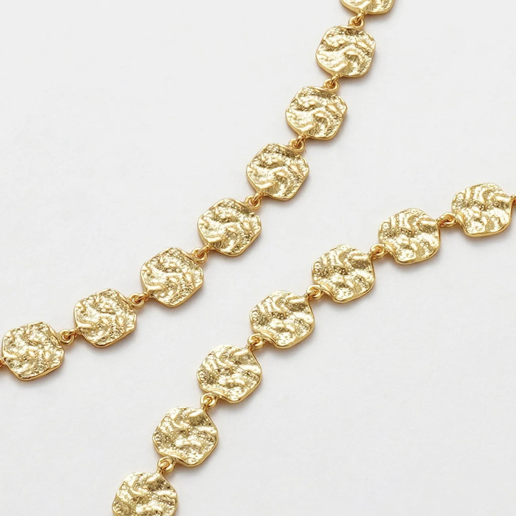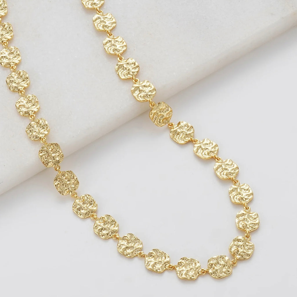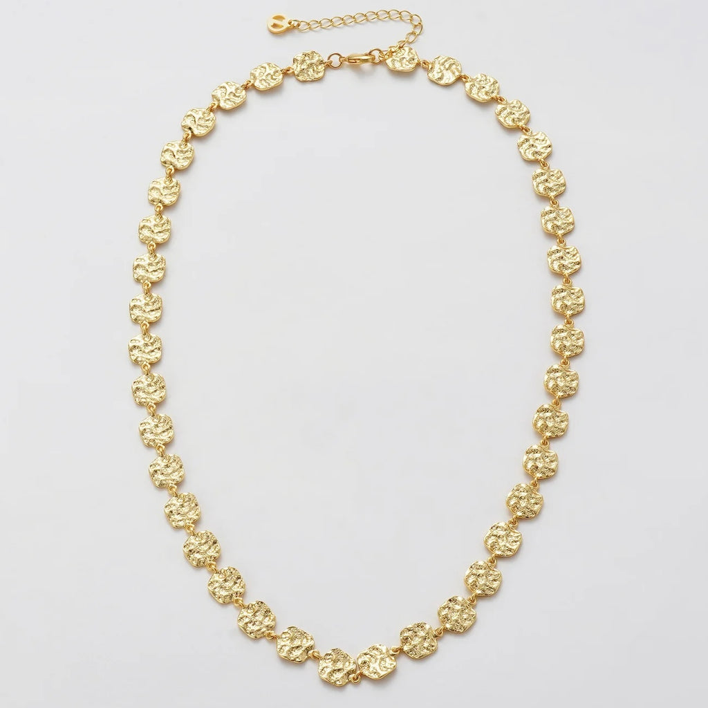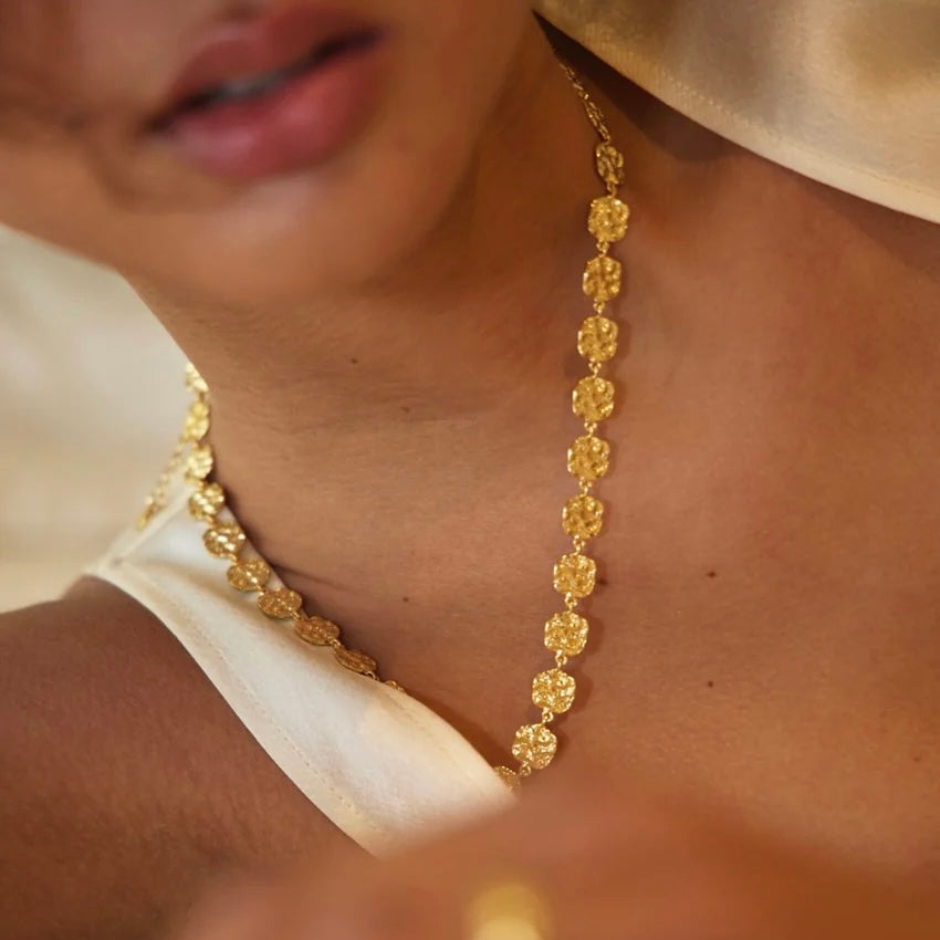 The Bonny Necklace is a modern classic with a textured twist. Featuring a chain of organic-inspired disks, each piece catches the light with a subtle shimmer, creating a look that’s both bold and versatile. Perfect worn solo as a statement or layered with finer chains, this necklace adds texture and elegance to any outfit. Pair with the Bonny Bracelet for the perfect stack.