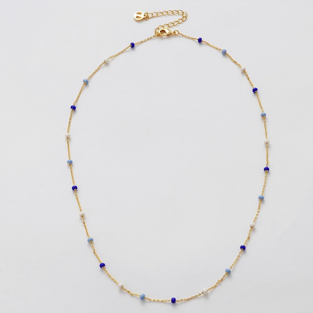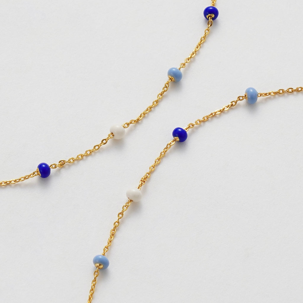 The Charlotte Necklace in gold and blue enamel is delicate and modern, ideal for adding a pop of colour to your layers.