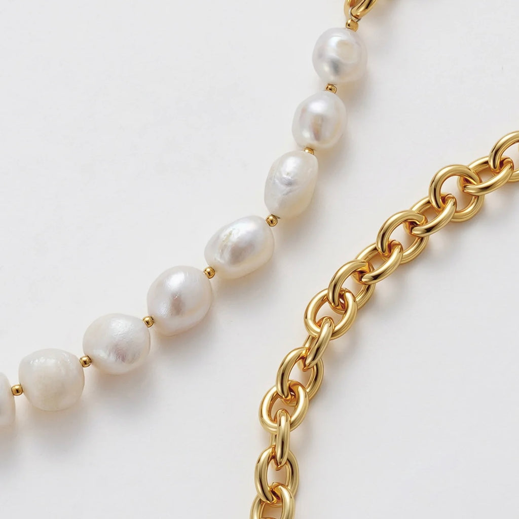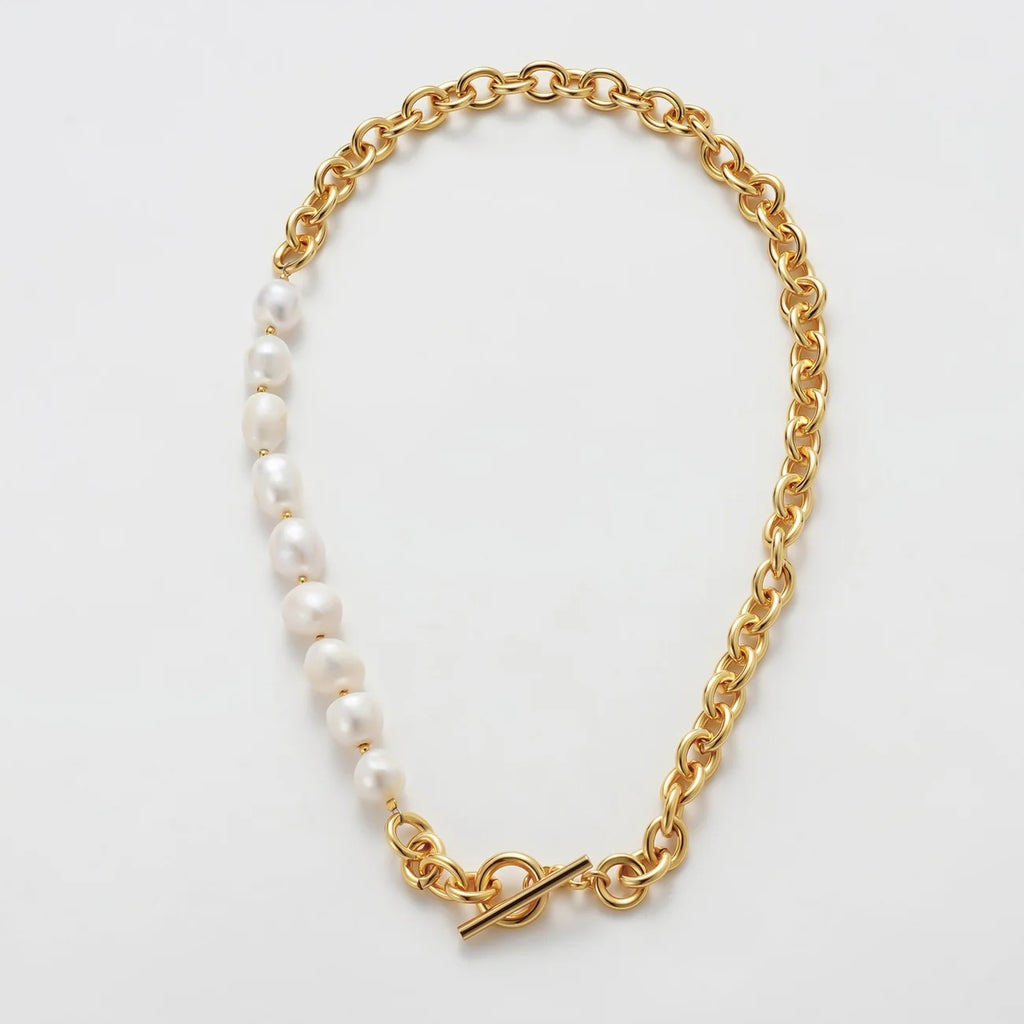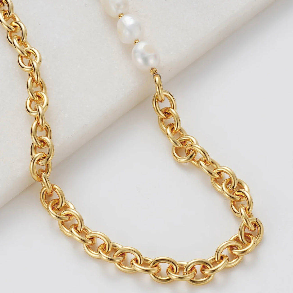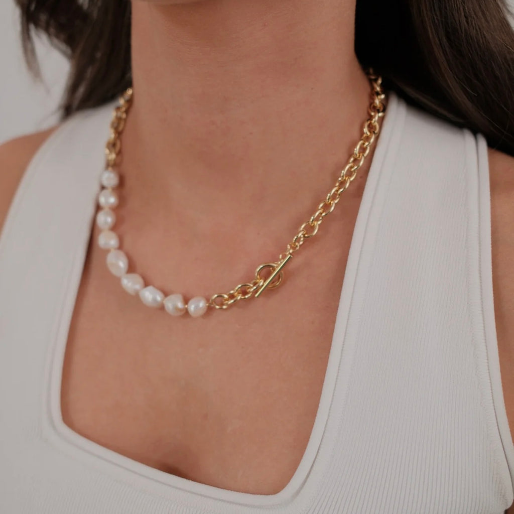 The Eliza Necklace is a modern take on timeless elegance, blending luminous freshwater pearls with bold gold link chain detailing. Finished with a classic fob clasp, this design adds a touch of sophistication while allowing effortless wear. Whether layered with delicate chains or styled solo as a statement piece, Eliza transitions seamlessly from day to night.