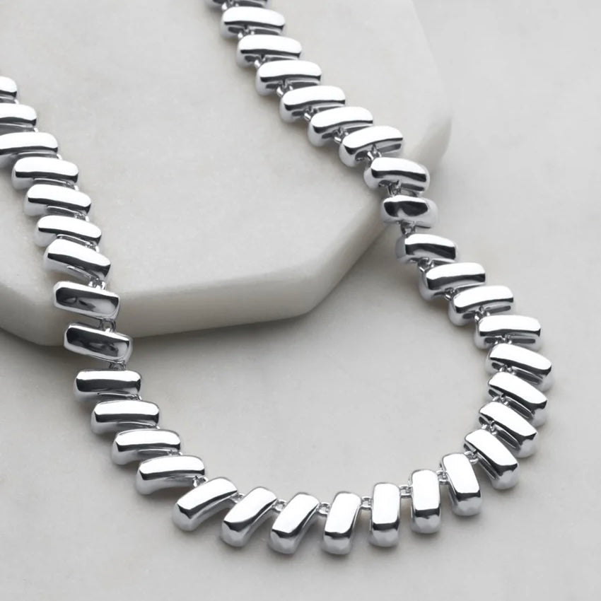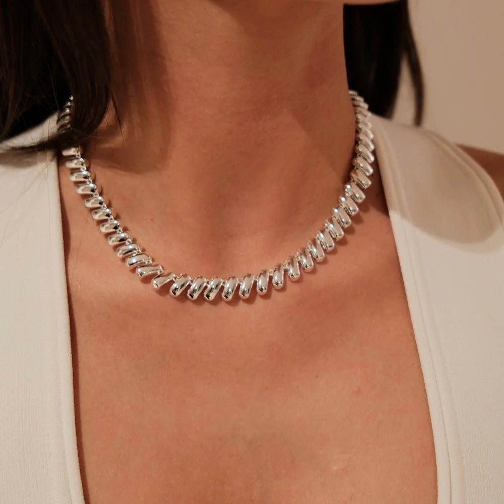 Emerson Necklace– Bold and striking, the Emerson Necklace is crafted from high-shine gold links with a modern, sculptural silhouette. Its chunky, fluid design makes it the perfect statement piece to elevate any outfit, whether worn alone or layered for a contemporary edge.