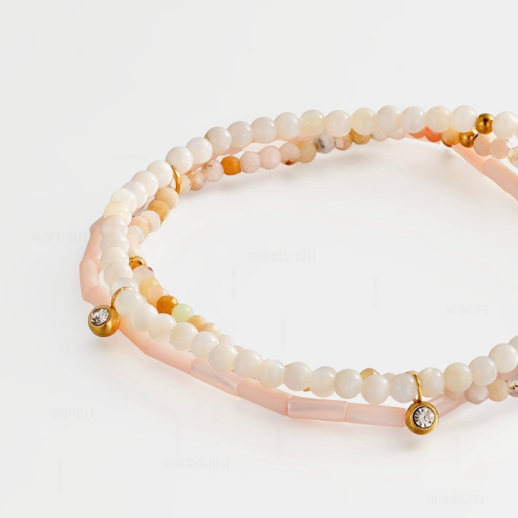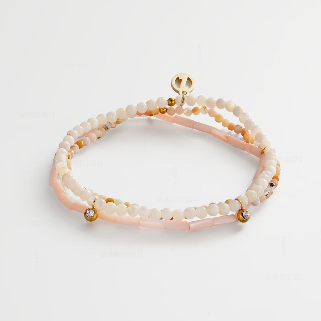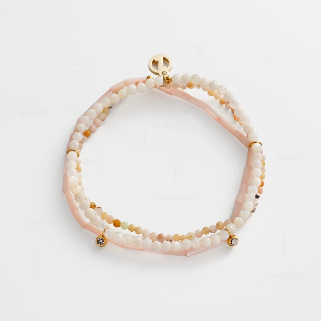 A delicate multi-strand bracelet designed with soft pastel beads that create a light, feminine palette, beautifully complemented by subtle gold-tone crystal accents for a hint of understated sparkle. The fine, lightweight strands drape comfortably on the wrist, offering effortless wear throughout the day. Elegant yet versatile, this bracelet adds a refined pop of colour to everyday outfits and layers seamlessly with other pieces for a chic, curated look.