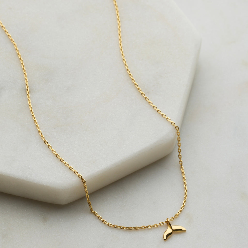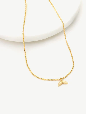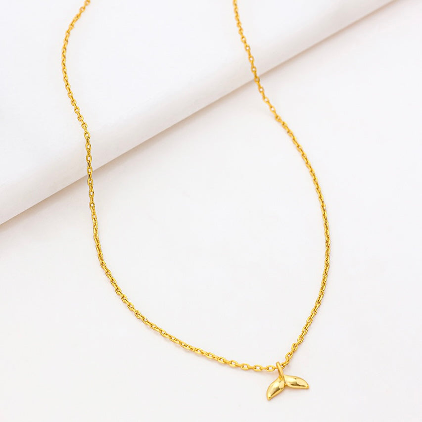 The Ocean Mini Necklace in gold features a subtle fin-shaped charm, celebrating seaside inspiration. A playful yet stylish design that pairs beautifully with summer looks.