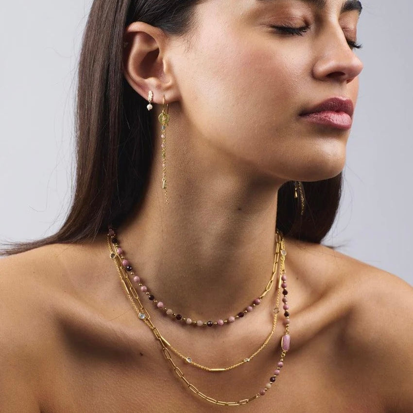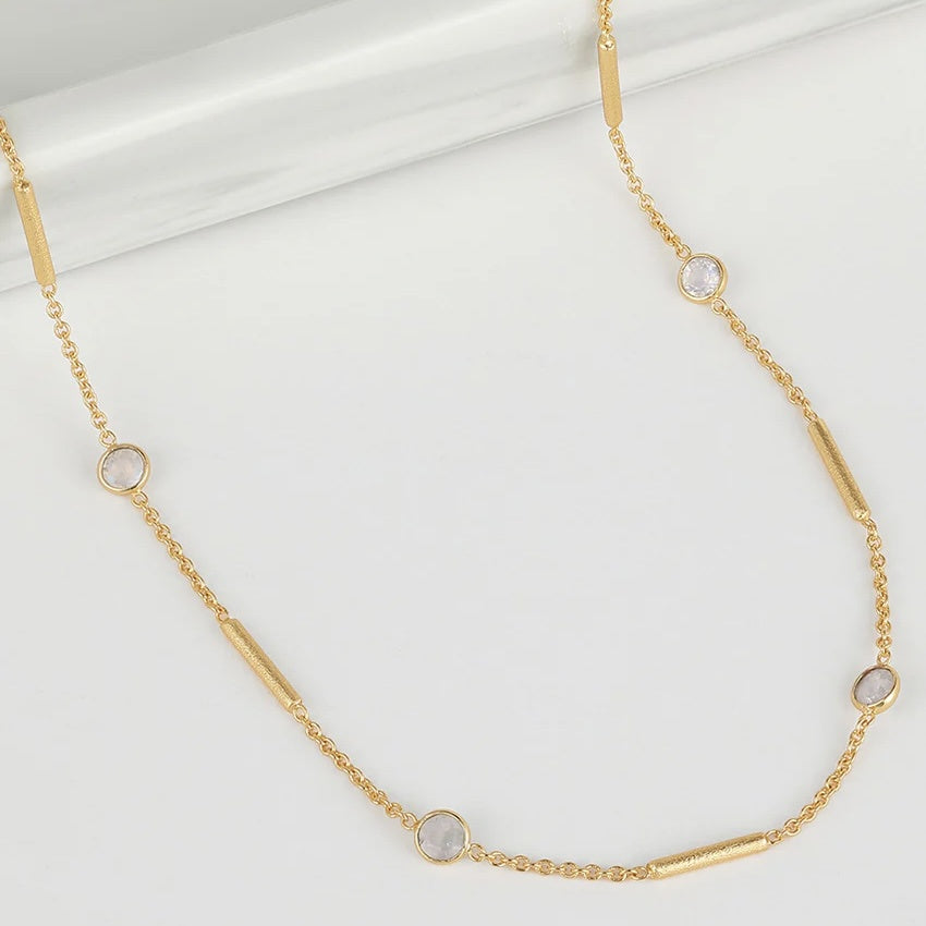 A captivating mid-length accessory that exudes elegance and sophistication. This necklace showcases a stunning combination of natural moonstones and delicate gold bar details. The Paloma Necklace is meticulously crafted to showcase the beauty of each individual moonstone, with its unique iridescent hues and captivating glow. Its mid-length design makes it versatile and perfect for layering or wearing on its own as a statement piece.