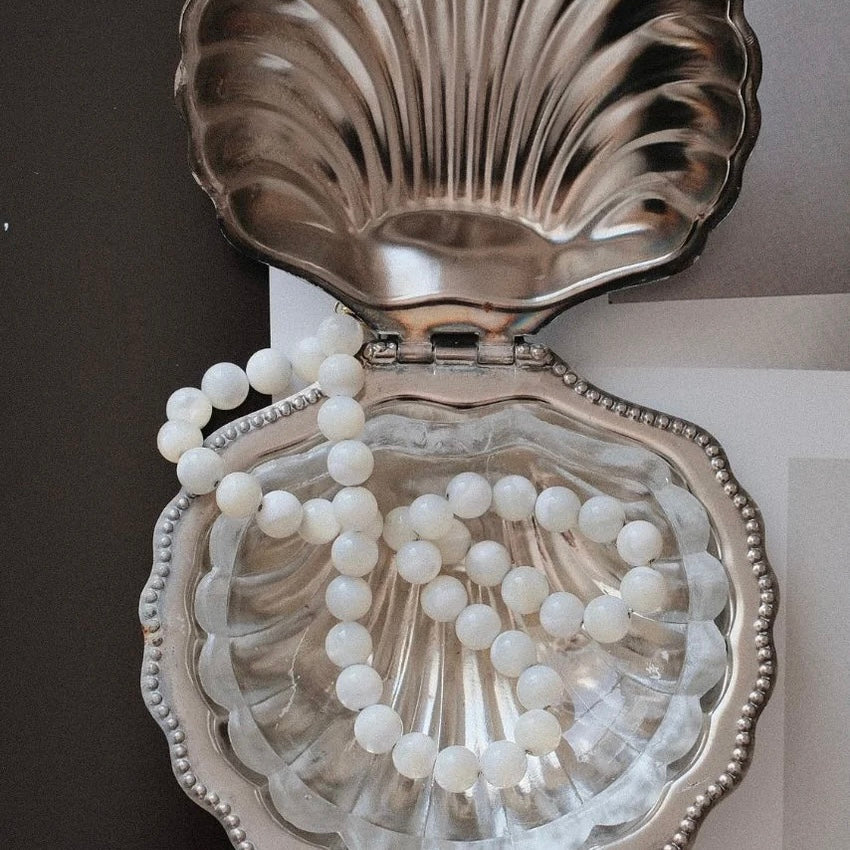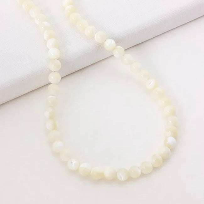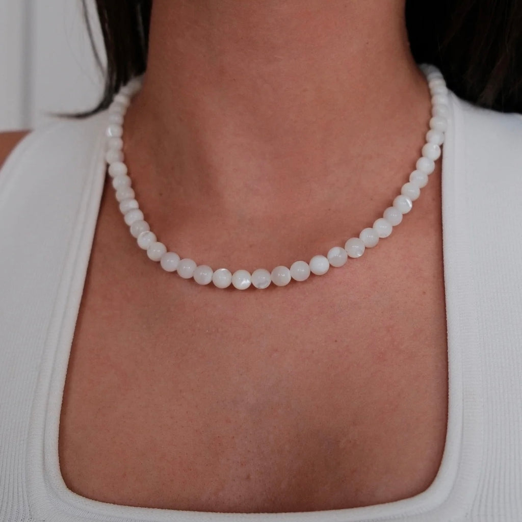 The Valentina Necklace is a statement piece featuring bold mother-of-pearl beads in an on-trend chunky silhouette. Effortlessly eye-catching, this necklace brings a modern edge to natural elegance—perfect for layering or wearing on its own.