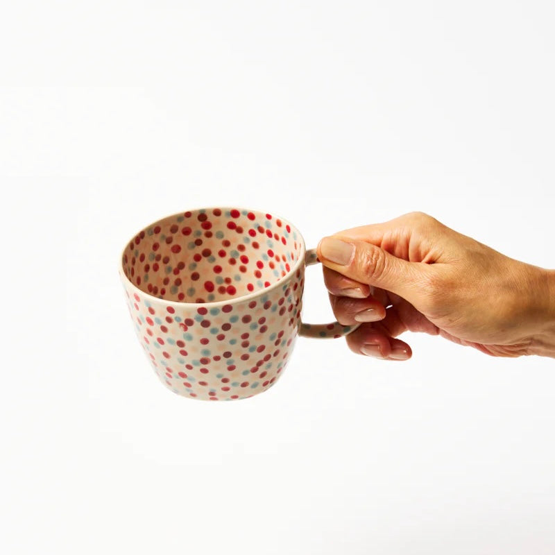 Brighten your daily rituals with the Chino Mug Confetti Sprinkle. Speckled with lively red and blue dots, this handmade earthenware mug combines playful design with practical comfort. Loved for its ergonomic handle and fine, thin ceramic lip, the Chino Mug makes every sip feel refined. Stackable and durable, it's a must-have coffee mug for everyday use.