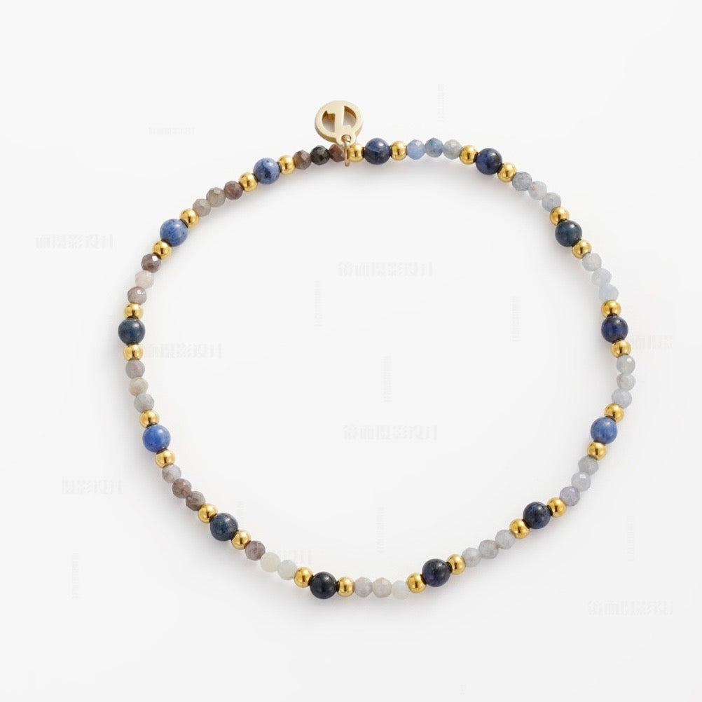 A refined bracelet featuring mixed blue and neutral-toned stone beads accented with polished gold-tone spacers. Perfect for effortless everyday wear or stacking.