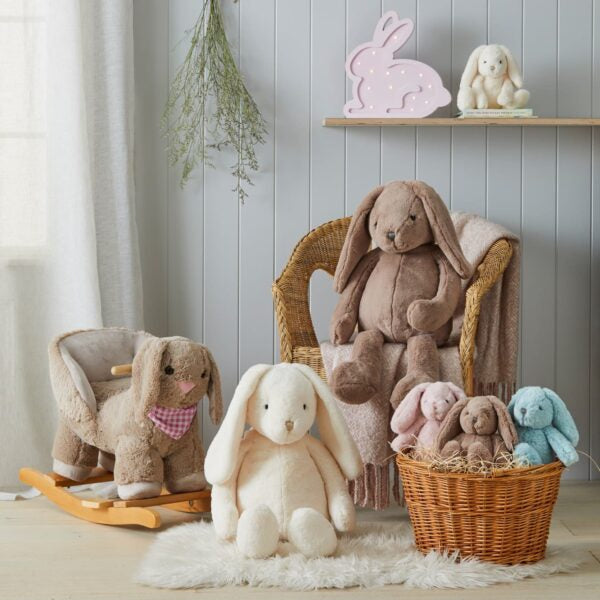 This lovable little bunny is the perfect companion for newborns and toddlers! Made from ultra-plush fabrics and child-safe trimmings, little ones will love the feel of it’s irresistibly soft fur, making it great for cuddles, and it’s beanie bottom will help it sit upright during playtime or when displayed on the shelf. This bunny also loves going on adventures, and can be carried around by it’s floppy ears, which are the perfect size for little hands to hold.