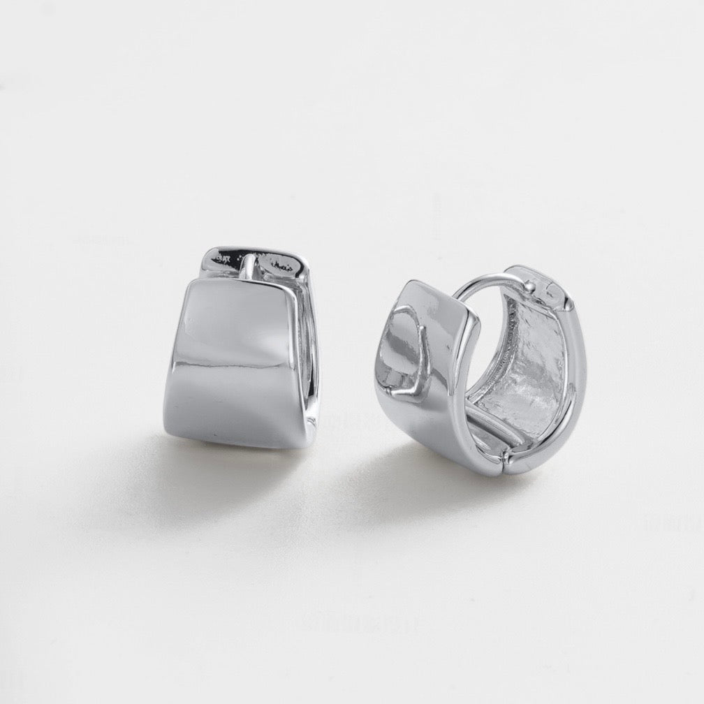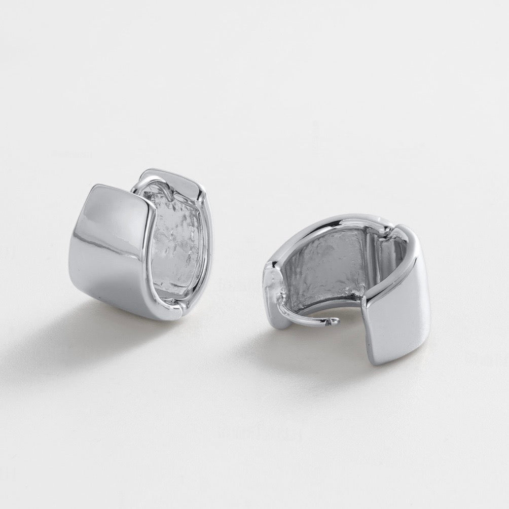 Modern silver-tone hoop earrings designed with a bold, sculptural silhouette that creates a striking visual impact. The high-shine finish enhances their sleek, contemporary appeal, catching the light beautifully from every angle. Confident and versatile, these statement hoops effortlessly elevate casual outfits and add a polished edge to evening looks.