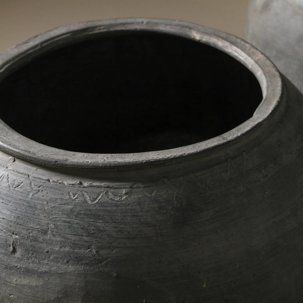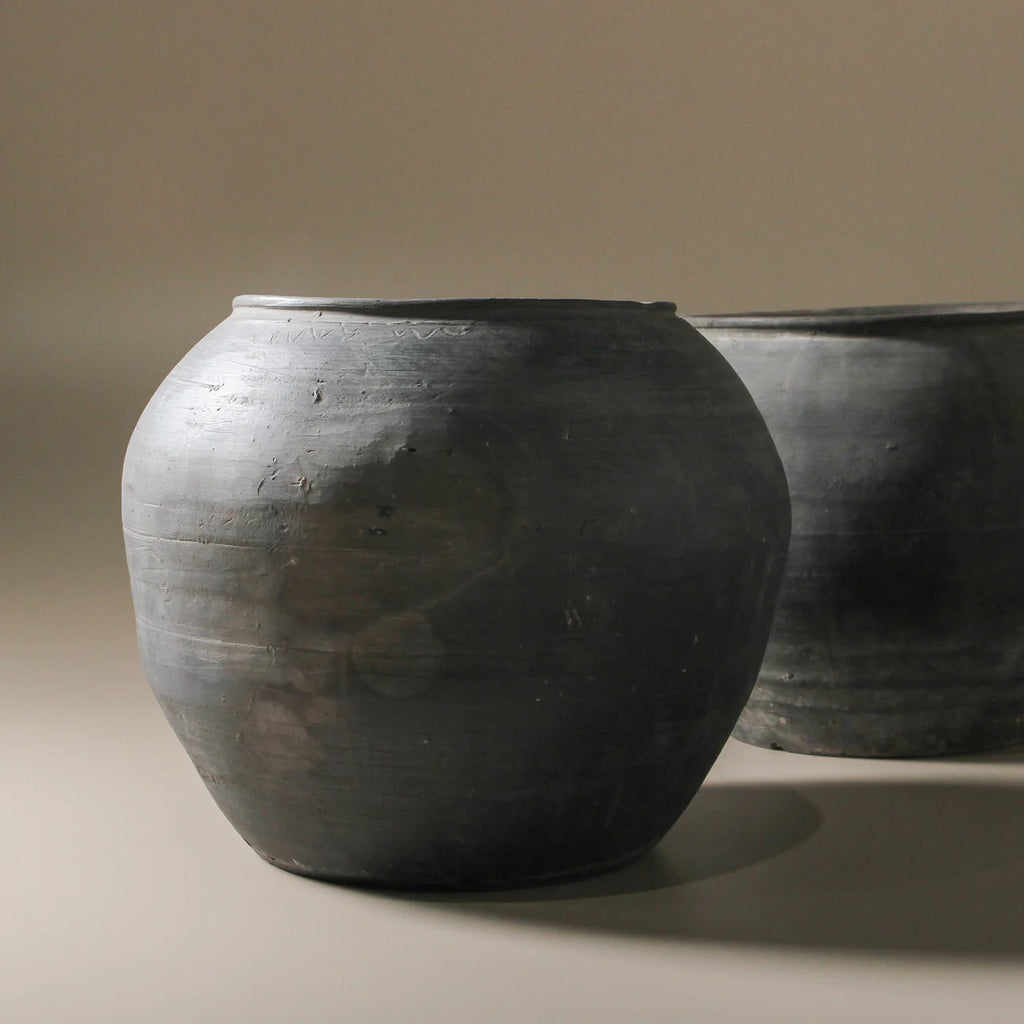 Crafted in Shandong Province 60-80 years ago, The Chinese Vintage Pot embodies the artisanal traditional pottery. Featuring darker tones and a matte finish, its surface showcases intricate textures and details that reflect its heritage and timeworn history. Originally used for food storage, this pot carries the marks of its practical past, adding depth and distinctive character to its design.