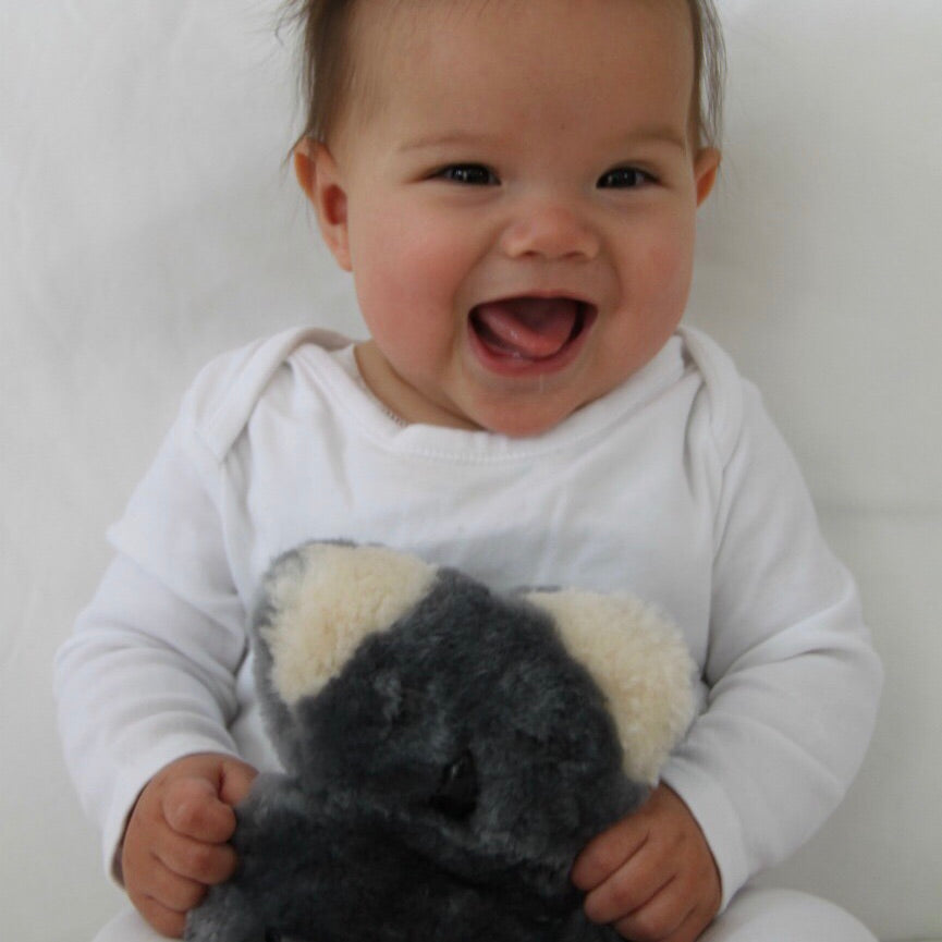 Soft, cuddly and flat, the FLATOUTbear is made of 100% Australian sheepskin shaped like a teddy bear. The FLATOUTbear is a unique product primarily used as a baby and children€™s comforter. It becomes a best friend and a well loved member of the family. 18cm tall x 16cm wide x 4cm flat Care: Cold spot clean and dry in shade. We suggest that you follow the SIDS guidelines as well as using a common sense approach when giving children the FLATOUTbear. Like with anything, we suggest parental supervision and we hope that the FLATOUTbear becomes a well-loved member of your family