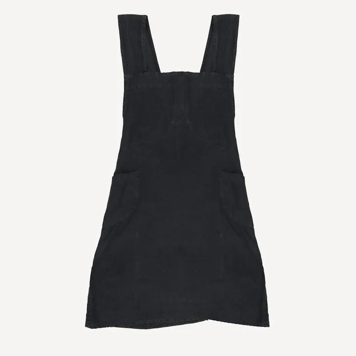 Relaxed cross back slip on apron in stonewashed black color. Made from 100% linen, this easy wearing apron is one size fits all.