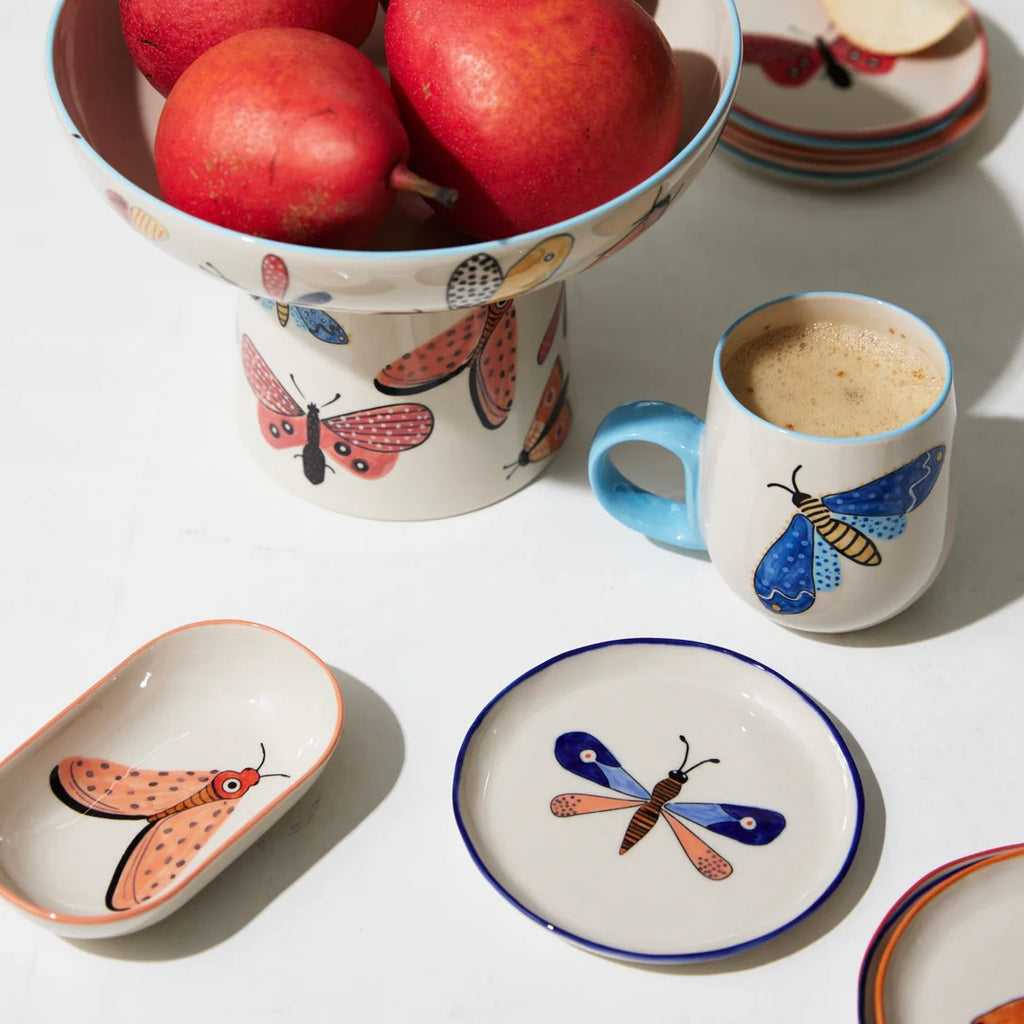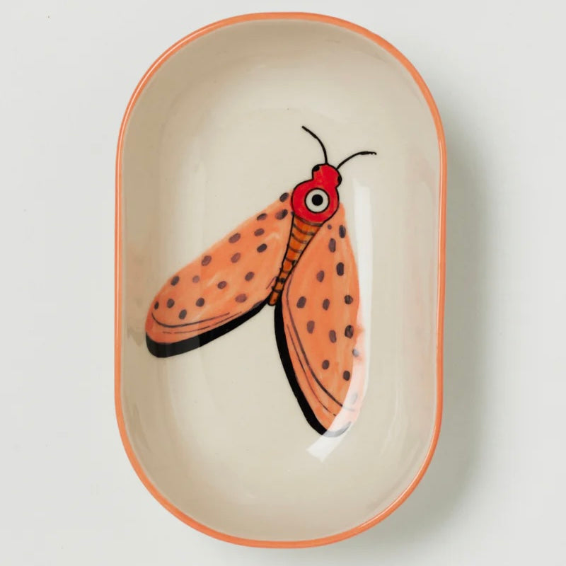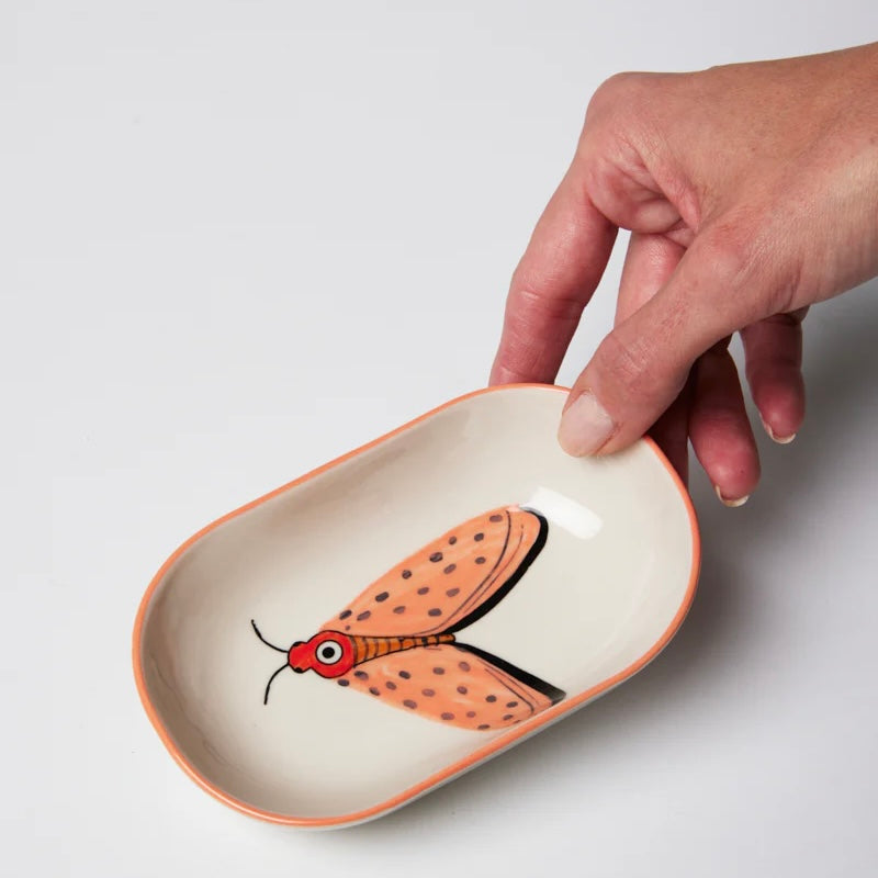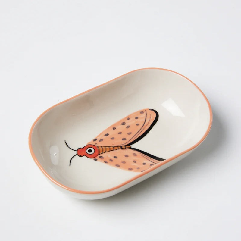 Celebrate nature's unsung heroes with these hand painted ceramic dishes showcasing intricate moth designs. Each rectangular dish depicts a different vibrant species by skilled artisans using specialty glazes. Extremely versatile for decorative vignettes, trinket dishes, or serving bites. Mix and match the one-of-a-kind high-fired stoneware pieces for a collected look celebrating these often overlooked creatures.