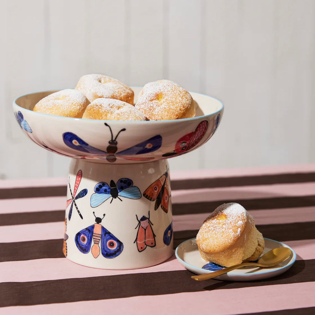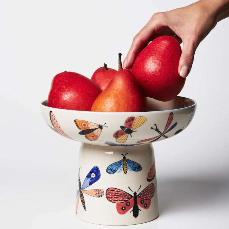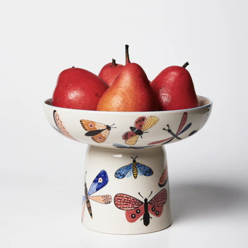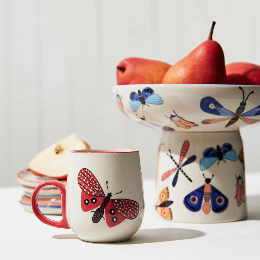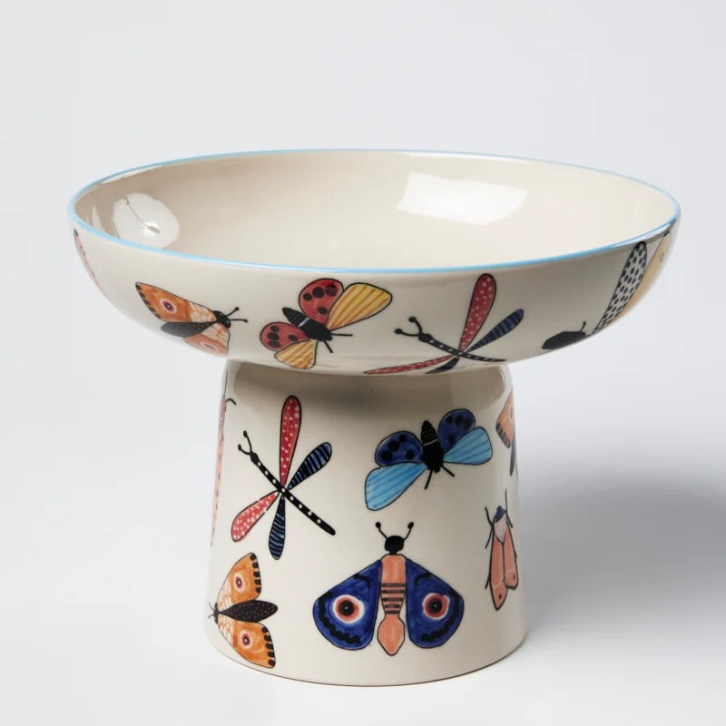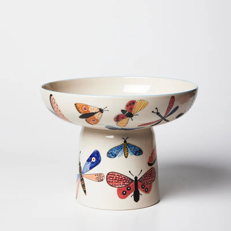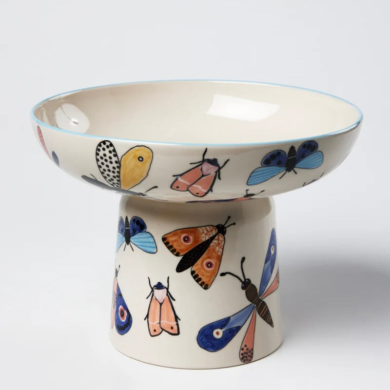 Bring a whimsical, hand-painted touch to your home with the Moth Party Footed Bowl. This ceramic piece is a true artistic accent, featuring a footed bowl shape covered in vibrant, multi-coloured moths rendered by skilled artisans. The varying bright hues and patterns adorn the entire exterior, creating an eye-catching focal point whether filled with fresh fruit or left empty to showcase the incredible craftsmanship. The elevated footed base adds an elegant silhouette. A unique conversation piece that celebrates the beauty of handmade ceramics.