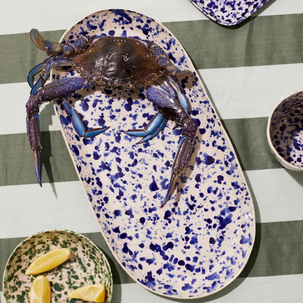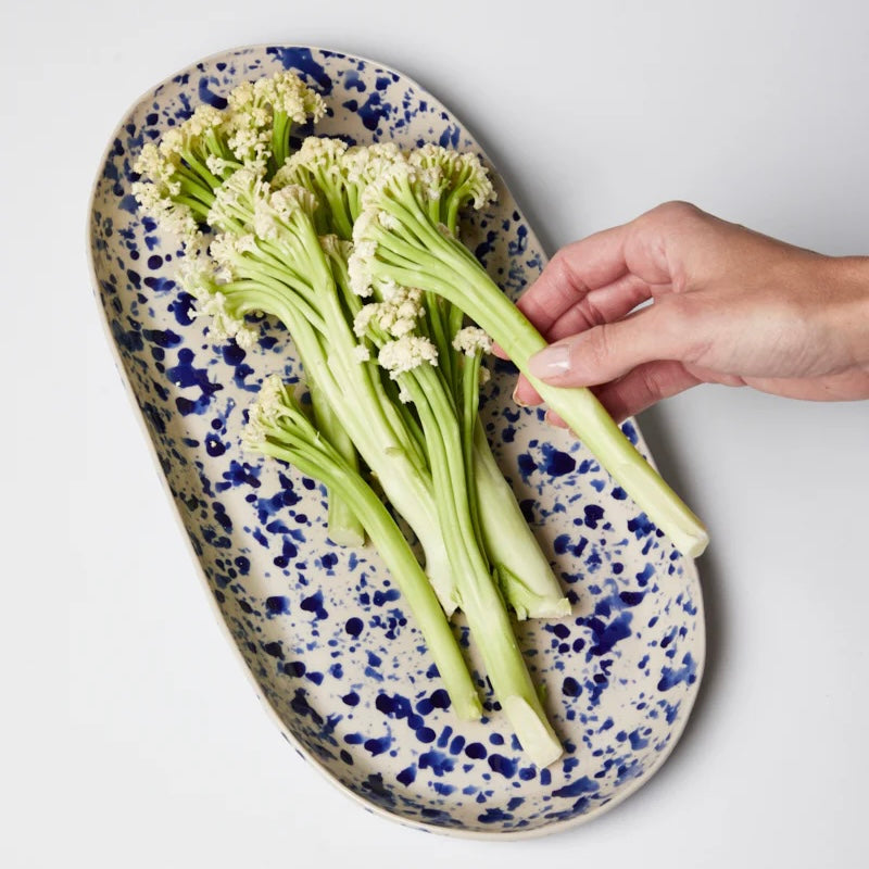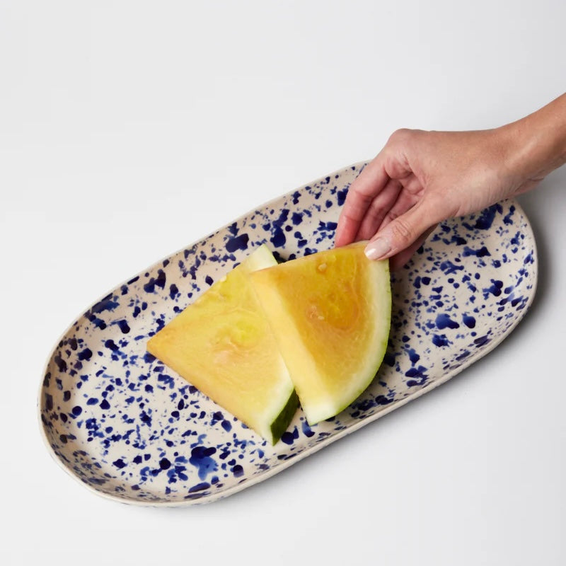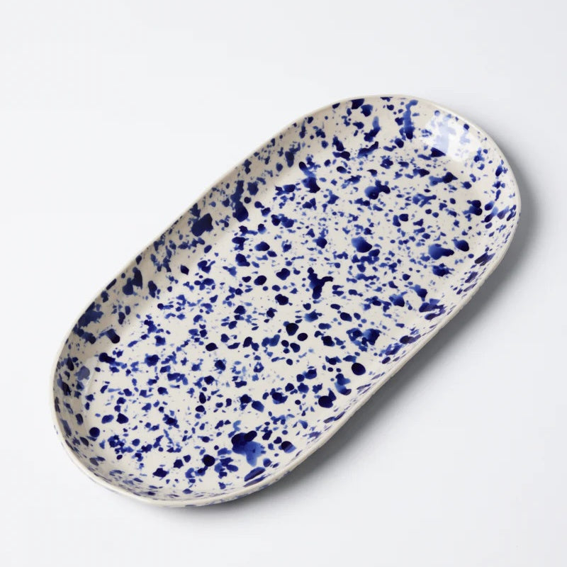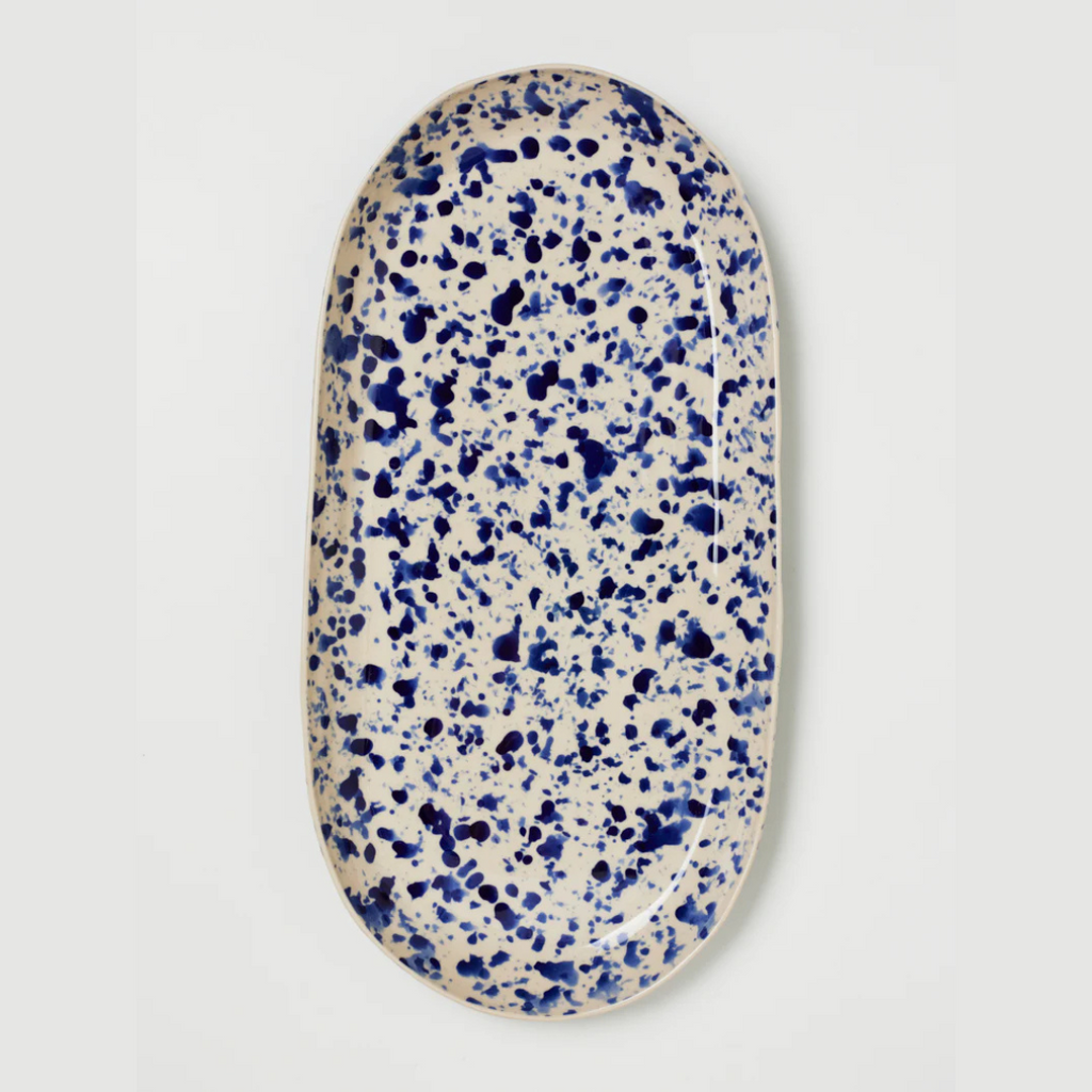 Add some serious handmade Italian charm to your kitchen with the showstopping Splatter Blue Platter! This ceramic beauty is hand-painted by artisans in that iconic "splatterware" style inspired by Puglia, with each one-of-a-kind piece splattered with rich navy blue glaze over a natural stoneware base in a celebration of centuries-old traditions. Whether serving up bruschetta or caprese salad, this durable, glazed stoneware platter is built to last and brings bold, handcrafted Italian style to your table - buon appetito!
