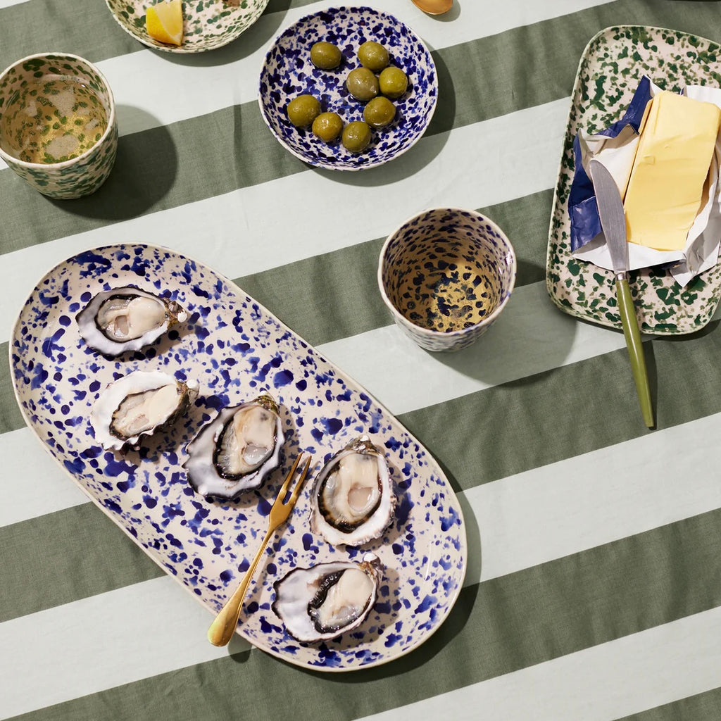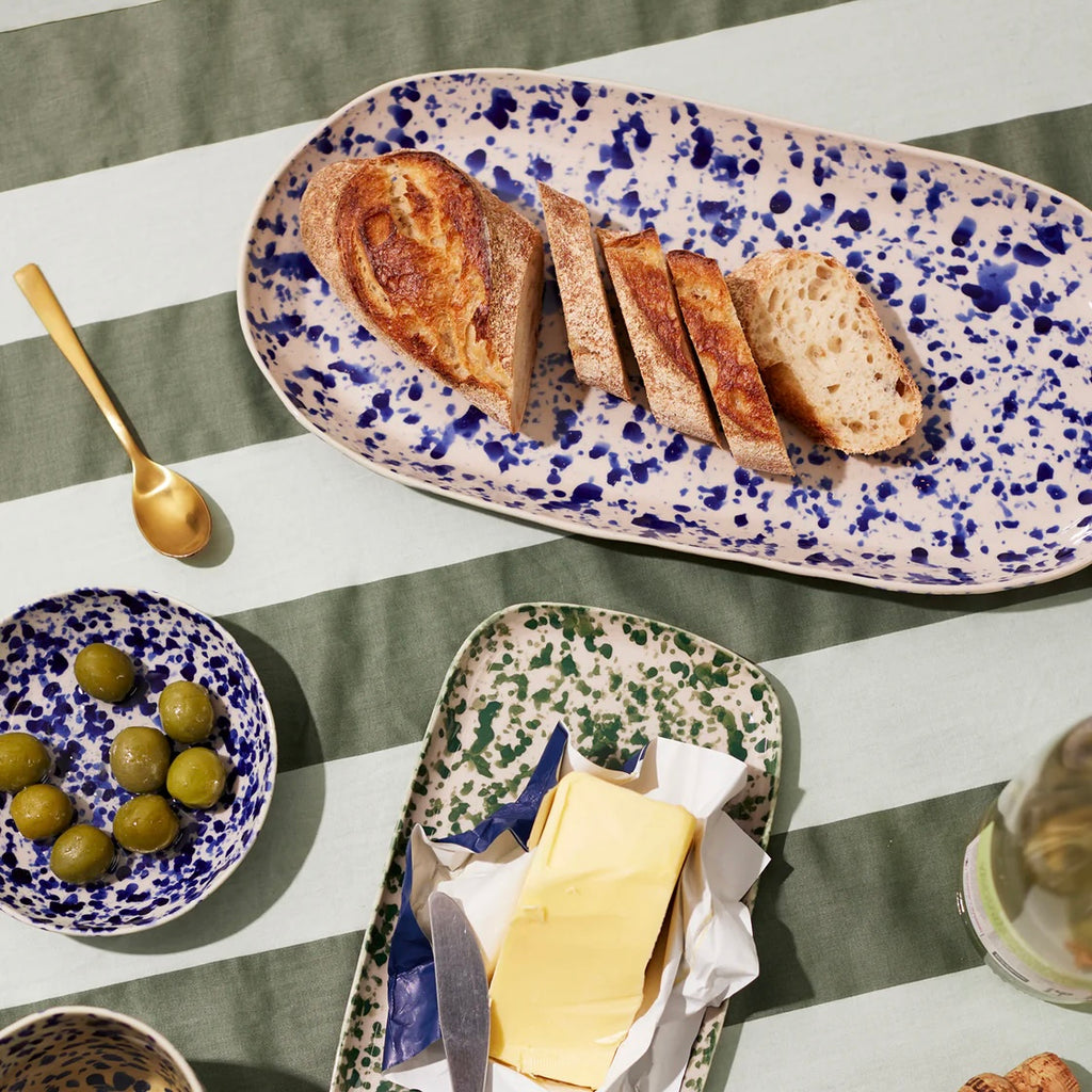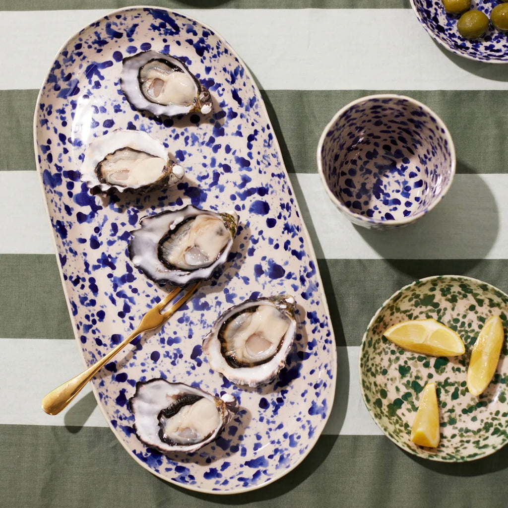 Add some serious handmade Italian charm to your kitchen with the showstopping Splatter Blue Platter! This ceramic beauty is hand-painted by artisans in that iconic "splatterware" style inspired by Puglia, with each one-of-a-kind piece splattered with rich navy blue glaze over a natural stoneware base in a celebration of centuries-old traditions. Whether serving up bruschetta or caprese salad, this durable, glazed stoneware platter is built to last and brings bold, handcrafted Italian style to your table - buon appetito!
