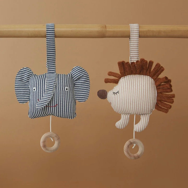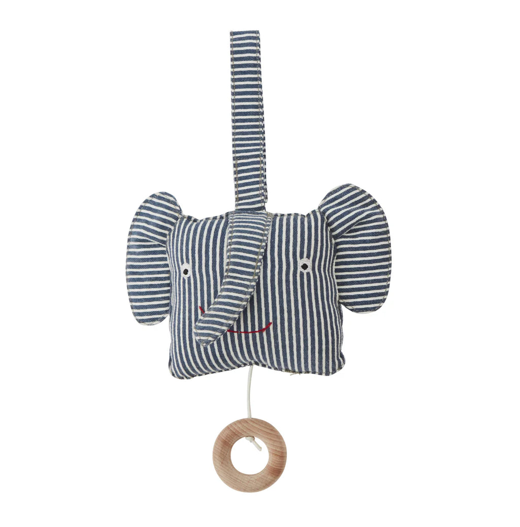 The Erik Elephant Music Mobile creates a cosy atmosphere to help your child fall asleep. The calm melody starts with the ring at the bottom is pulled down. Made of 100% organic cotton with a polyester filling. Measures 16cm (H) x 9.5cm (W).