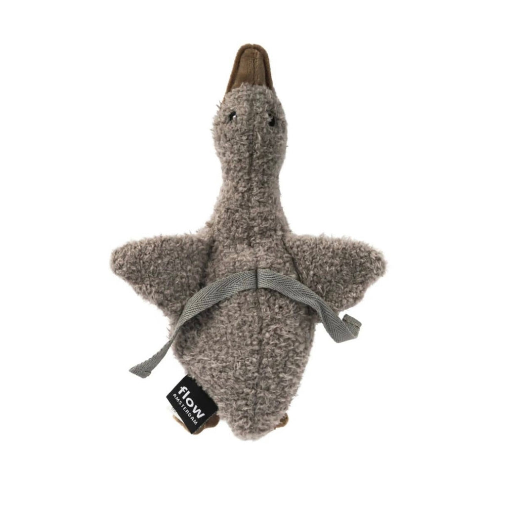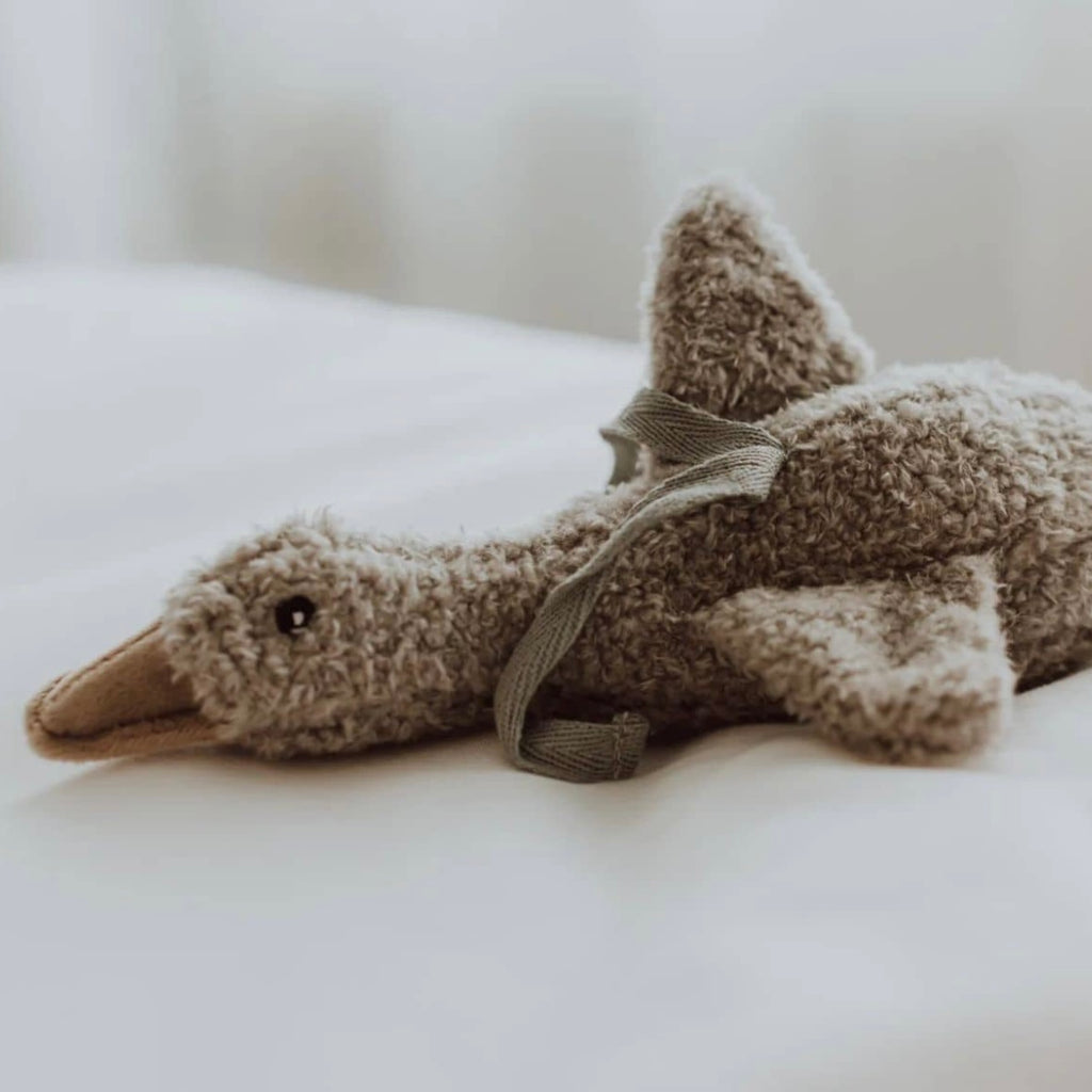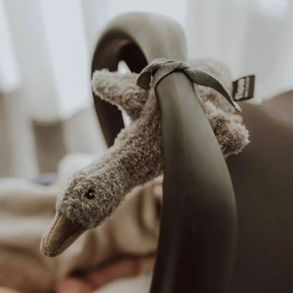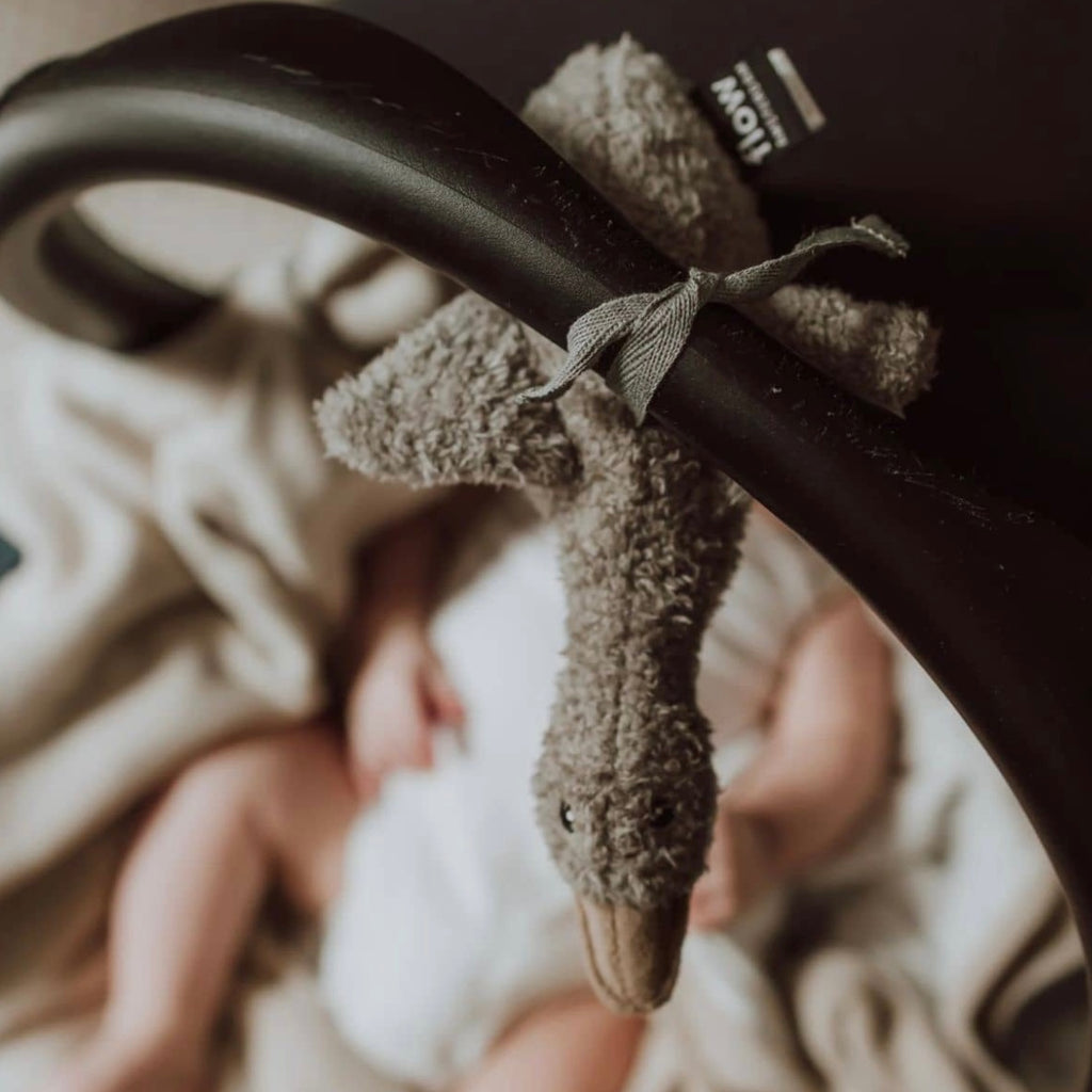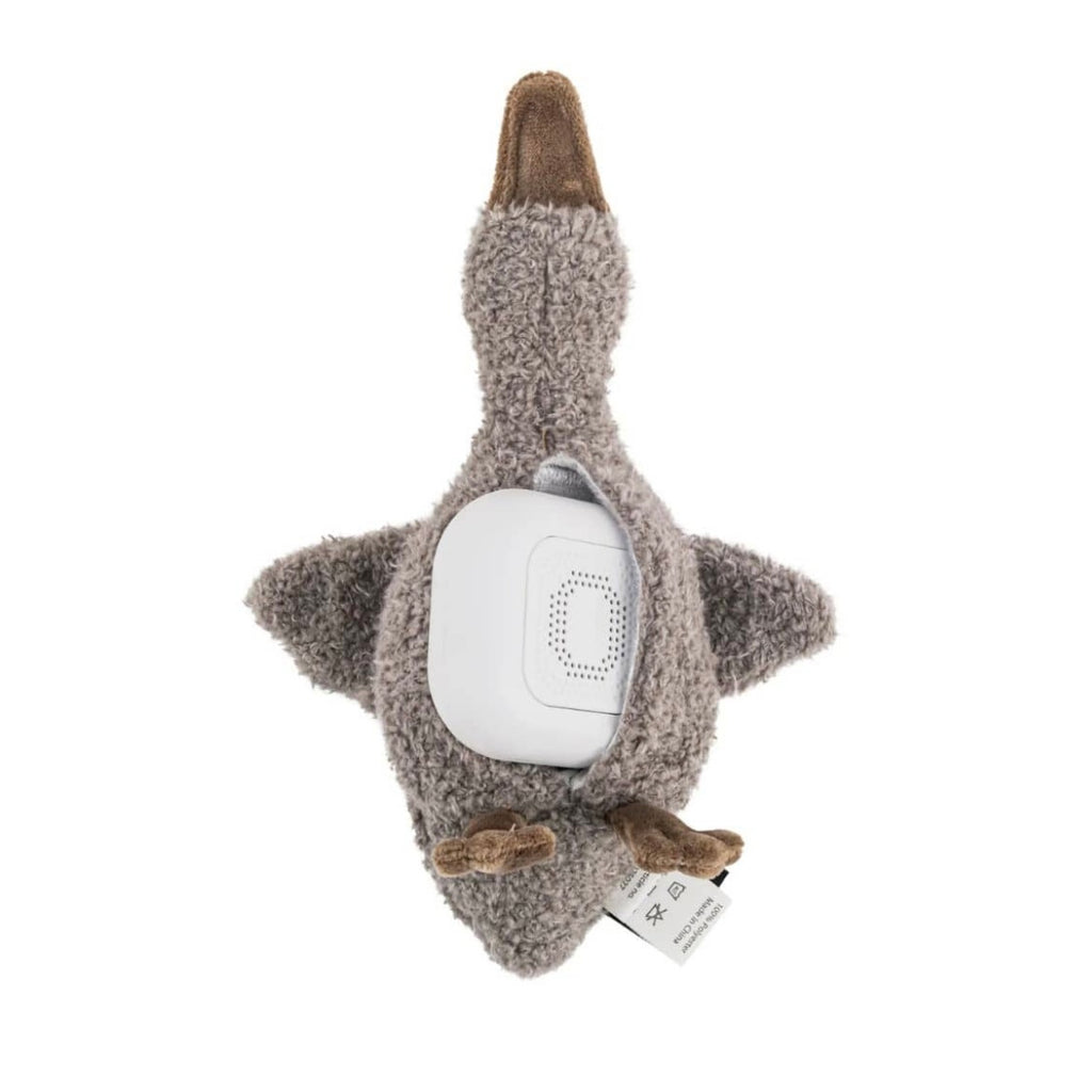 The comforter on the go is a smaller version to bring with you on the go. The comforter with heartbeat gives your child a safe and calm feeling while on the road. You can easily attach the goose to the Maxi Cosi or stroller with a string. The comforter comes with a music box with 2 sounds: heartbeat and white noise. Using one large button you can turn on the music box, adjust the volume and switch between the two sounds. Because the button is extra big, the music box is easy to handle, even when it's placed in the comforter.