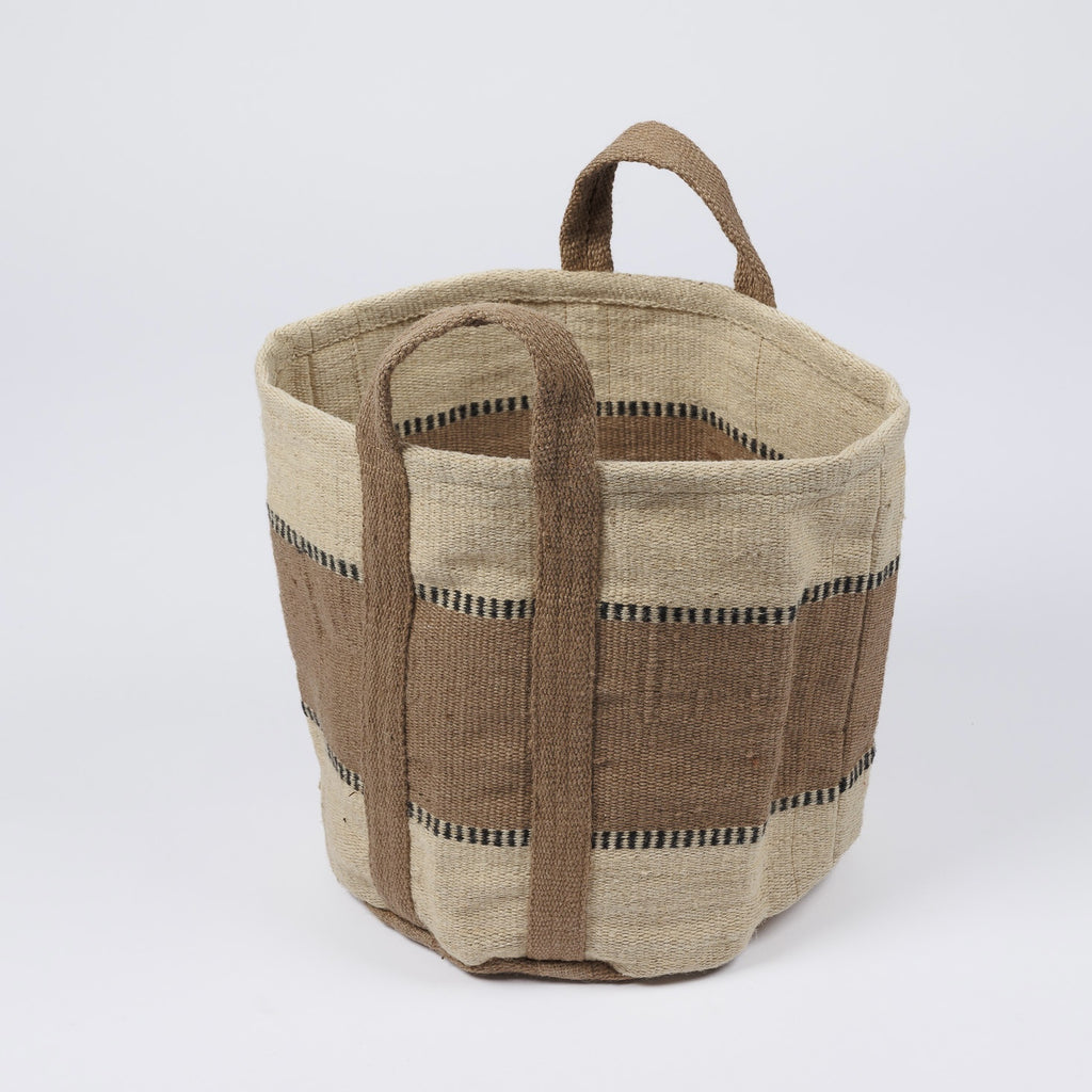 The Getaway Basket in natural with taupe was  handwoven in India using Linen & Cotton with a poly fill. This basket is multi purpose.