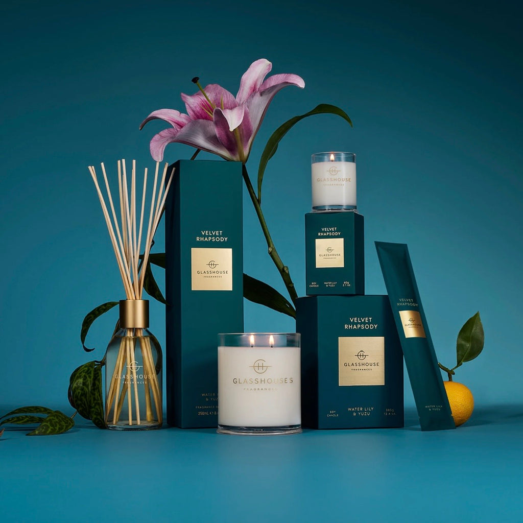 The Velvet Rhapsody Water Lily & Yuzu 380g Triple Scented Soy Candle is part of the Floral Fragrance Family. Floral fragrances are classic and graceful, defined by fresh cut flowers, solifores (single floral notes) or bouquets with fruity highlights or powdery softness.