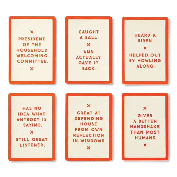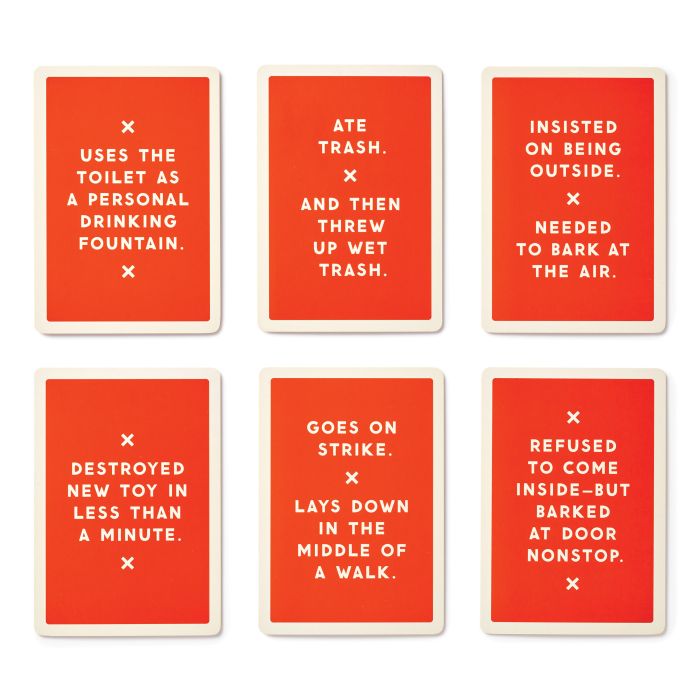 Includes 50 double-sided cards to photograph with your dog–great for annoying other people on social media with.