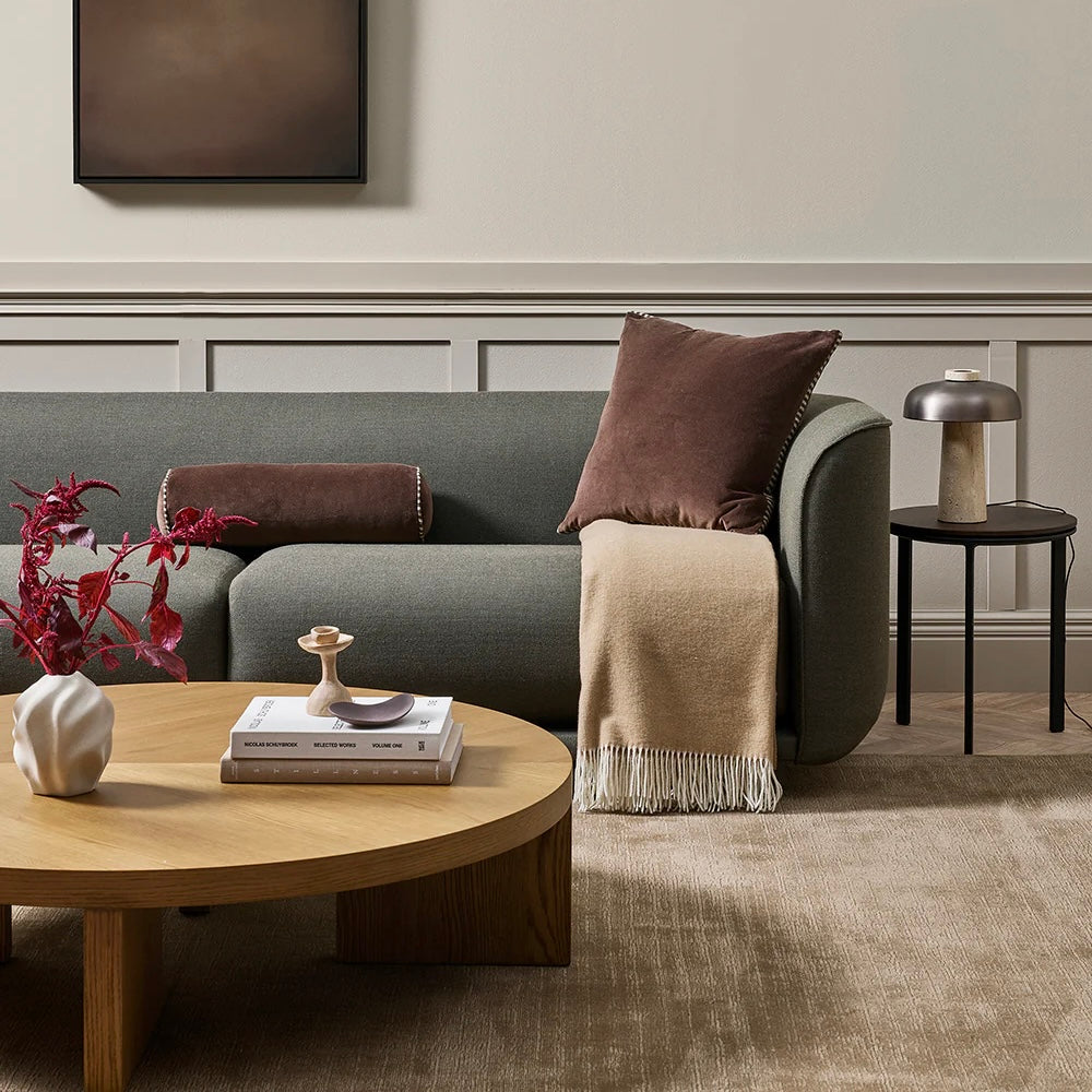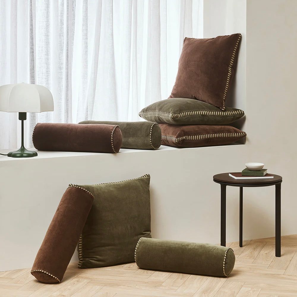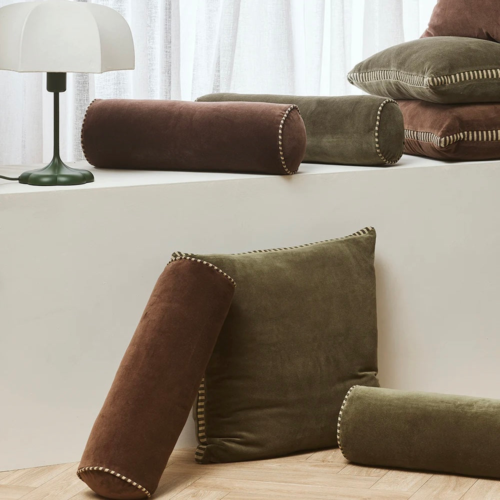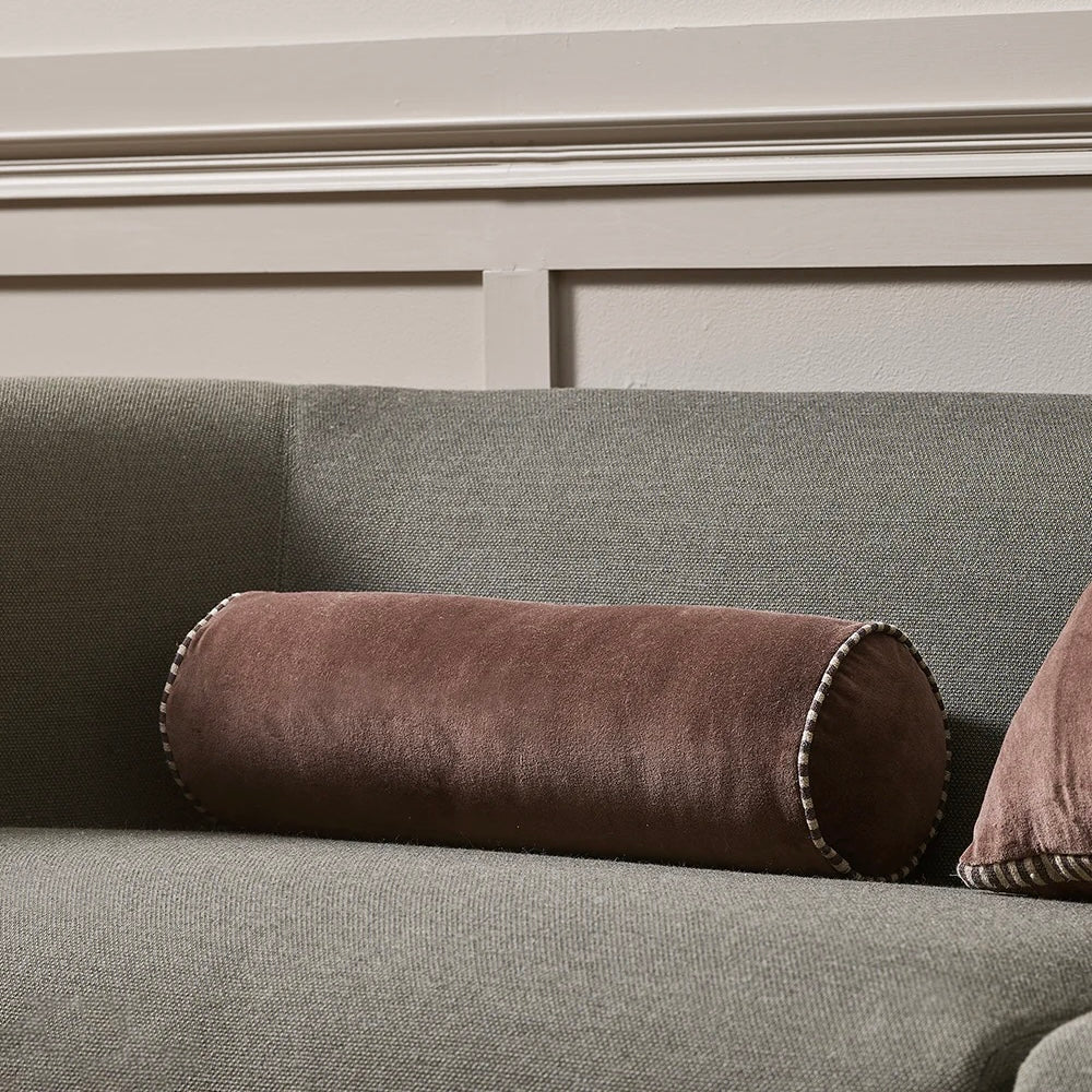 Create an alluring, sophisticated space with the sculpted, cylindrical form of the Elliot bolster. Balancing softness and structure, plush chocolate velvet is edged with striped linen piping, for a piece that is both visually striking and inviting to touch. Designed to bring dimension and luxury to everyday living, Elliot pairs beautifully with the boxy silhouette of the Edward cushion - creating a layered aesthetic that feels timeless and considered.