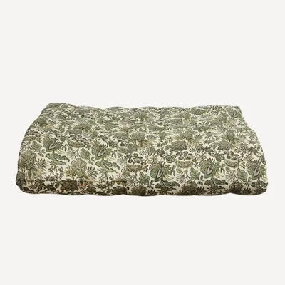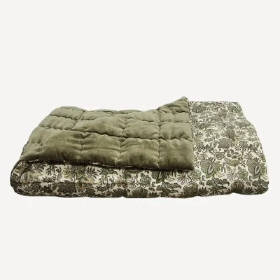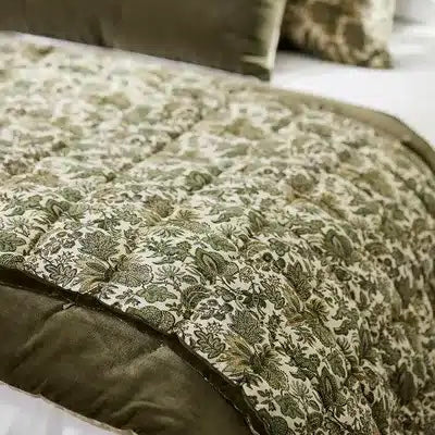 Luxurious velvet eiderdown in olive green, backed with a charming brocade print in cotton linen. A great addition for the end of the bed to bring glamour and warmth on cold winter nights.