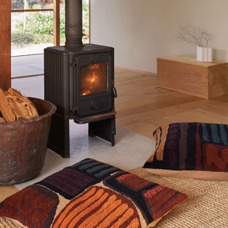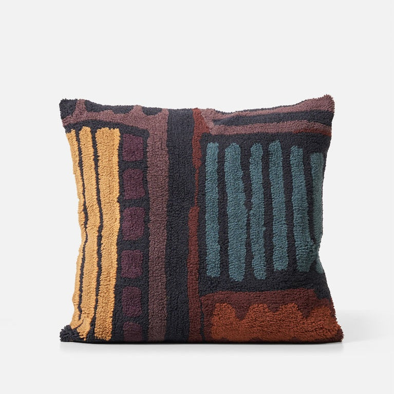 The cushion features a pattern hand-painted by Imogen, showing abstract interpretations of elements from her home. The front is made from soft, fluffy wool, while the back is made from heavyweight cotton canvas.