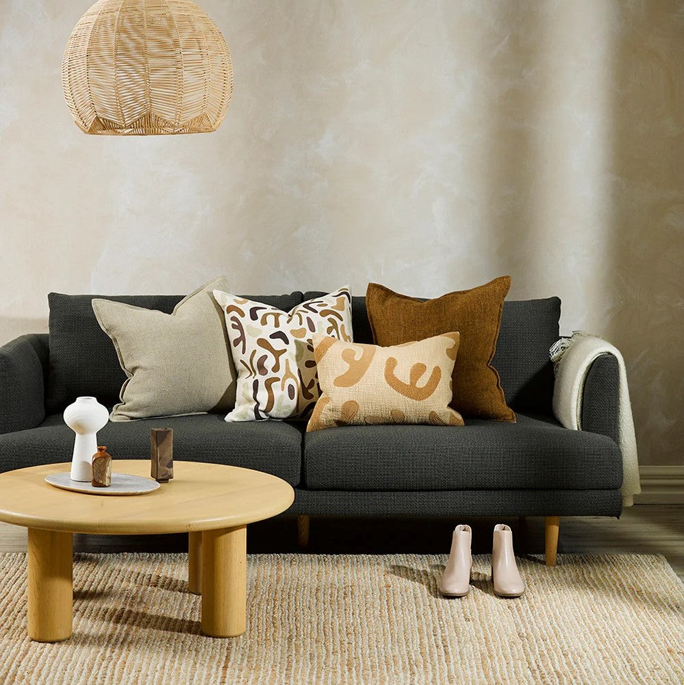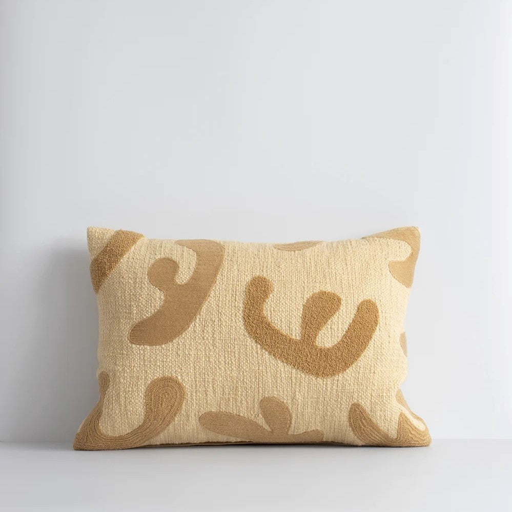 Embroidered, boucle and textural elements come together in this Matisse-inspired cushion. Hand-cut, oversized forms are assembled onto a tactile, cotton base, with a tone-on-tone aesthetic. Mix the lumbar shape with Flaxmill Pecan and Silhouette cushions to create a cosy and comforting space.
