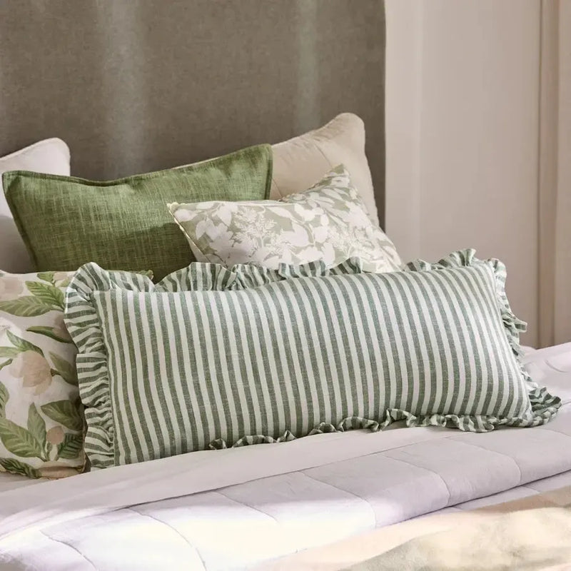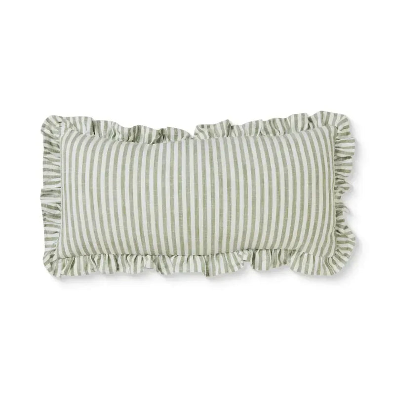 Ruffles by name and by nature, this joyful cushion features soft green and white verticle stripes, paired with a romantic ruffled edge. Its elongated shape makes it an ideal statement for a bed, or standalone choice for a sofa.